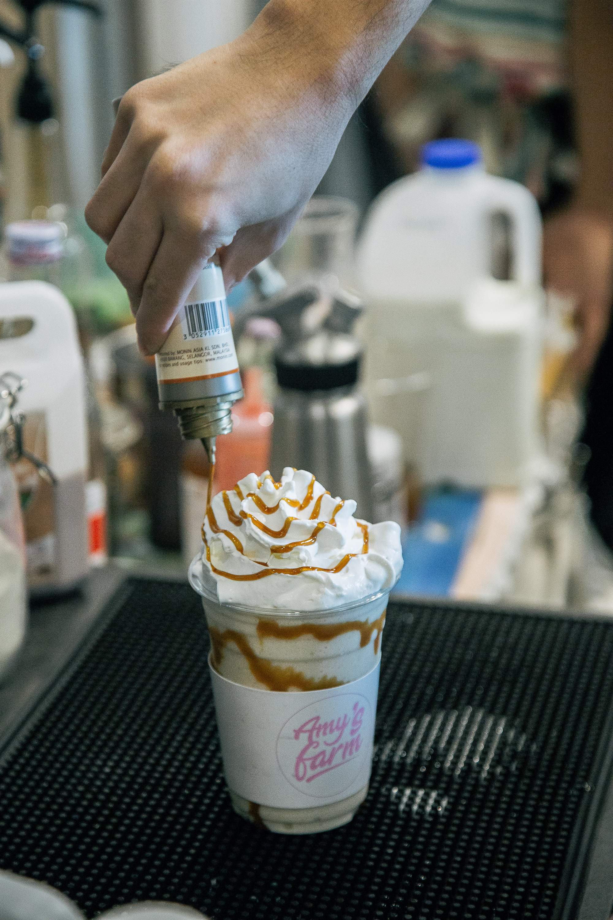 สำหรับเมนูของที่นี่สร้างสรรค์ขึ้นในคอนเซ็ปต์ Healthy but Delicious เพราะสิ่งที่ดีต่อสุขภาพไม่จำเป็นต้องรสชาติจืดเสมอไป ดังนั้นแต่ละเมนูของทางร้านจะให้ความสำคัญกับวัตถุดิบและรสชาติเป็นหลักเริ่มต้นจากการเลือกใช้นมสดออร์แกนิกคุณภาพดีจากนำมาผลิตเป็นเมนูนมสด ไอศกรีม และภายในร้านยังเลือกใช้ขนมปังที่ผลิตจากข้าวสาลีคุณภาพสูง ที่จะช่วยเพิ่มประสิทธิภาพในการย่อยอาหาร เริ่มต้นกันที่เมนูแรก Banana Butterscoth (120 บาท) กล้วยปั่นกับนมสดบัตเตอร์สก็อตให้รสชาตินมกลมกล่อมหอมกลิ่นกล้วย ท็อปด้วยโฮมเมดวิปครีมราดซอสคาราเมล สำหรับเมนูถัดมาใครที่เป็นคอกาแฟลองสั่ง Ice Cream Affogato (120 บาท) ไอศกรีมวานิลลาเสิร์ฟกับเอสเปรสโซ่รสชาติเข้มข้นที่ผลิตจากเมล็ดกาแฟที่ได้มาตราฐานส่งตรงจากดอยห่มปก จังหวัดเชียงราย โดยกรรมวิธีการคั่วแบบ Light to Medium เหมาะสำหรับคนที่ชอบรสชาติแบบเปรี้ยวเล็ก ๆ แต่ถ้าหากใครชอบทานแบบเข้มหรืออ่อนไปเลยสามารถแจ้งรสชาติกับบาริสต้าและพนักงานได้ ต่อกันด้วยอีกหนึ่งเมนูที่คนไทยชื่นชอบ Pandan Kaya Toast (85 บาท) ขนมปังสังขยาที่ใช้ขนมปังชาโคลคุณภาพดี เนื้อนุ่มเสิร์ฟกับสังขยาสูตรคุณแม่ของเจ้าของร้านให้ได้รสชาติที่กลมกล่อมหวานแบบธรรมชาติและวิปครีมราดซอสสตรอเบอร์รี Amy's Farm Thailand ยังคงมีเมนูอื่น ๆ อีกมากมายให้ได้ไปลิ้มลองอาทิเช่น Strawberry Milk Shake (110 บาท) นมสดออร์แกนิกรสสตรอเบอร์รีปั่นกับเนื้อสตรอเบอร์รีแท้ ๆ หรือจะลอง Pandan Kaya Chathai (85 บาท) เมนูขนมปังสังขยาชาไทย ที่เลือกหยิบชาที่คนไทยชอบทานมาเป็นส่วนประกอบสำคัญ หรือสั่งผลิตภัณฑ์นมสดและขนมปังได้ที่ 098-252-2564 หรือ LineManAmy's Farm Thailand