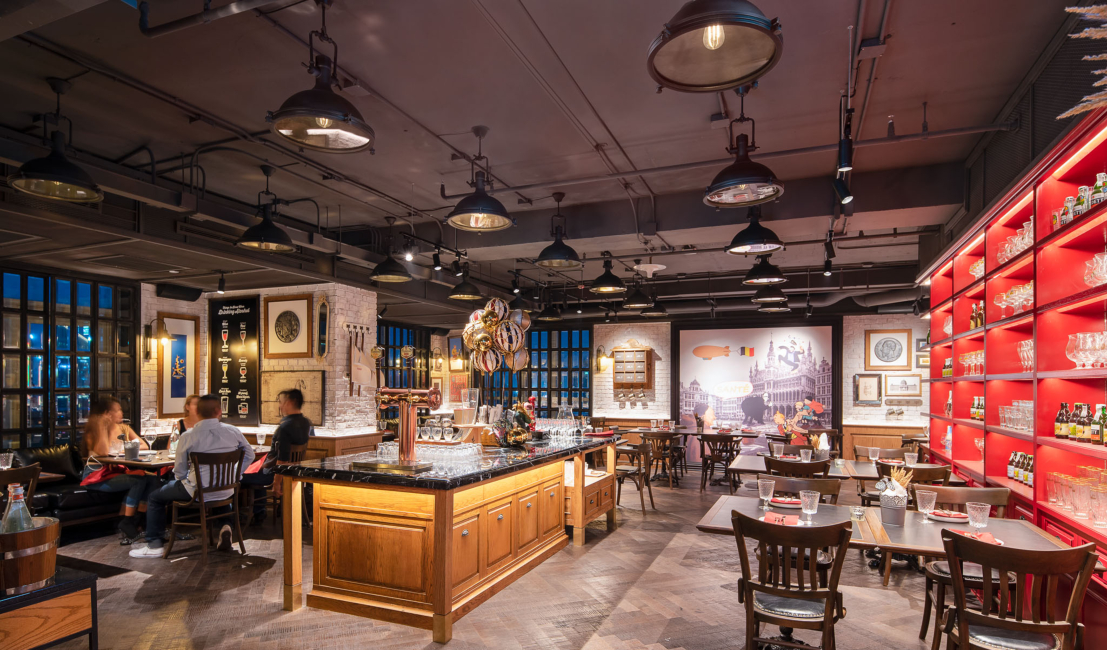 บรรยากาศภายในร้าน ตกแต่งในสไตล์เบลเยียมต้นตำรับที่ลงตัว ด้วยกลิ่นอายการตกแต่งที่ดึงดูดด้วยโทนสีแดงขรึมเท่เหมือนสไตล์ Wong Kar-Wai หรือสีนีออนสลัว ๆ ของไฟประดับที่ทางร้านอาหารเลือกนำมาใช้เพื่อสร้างความโรแมนติกนั่นเอง