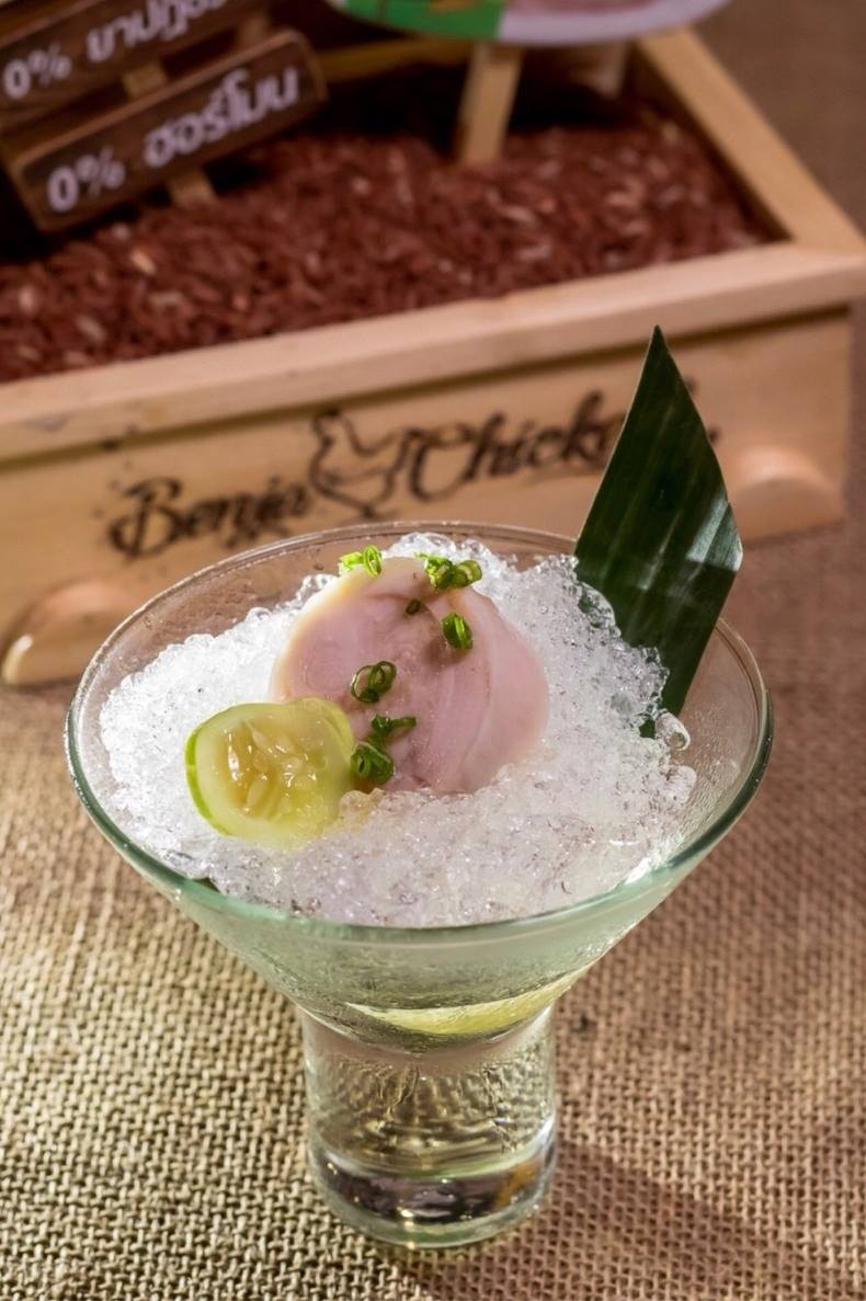Benja Chicken ร่วมกับ Chim by Siam Wisdom นำเสนอหลากหลายเมนูอาหารจานหรูคู่มิชลินสตาร์ ด้วยกรรมวิธีที่เป็นเอกลักษณ์ของเชฟหนุ่ม ในสไตล์ Sit-down Dinner แบบสบาย ๆ และเป็นกันเอง โดยในครั้งนี้ได้มีการนำเอาวัตถุดิบหลักคุณภาพดีอย่างไก่เบญจา ไก่สดชั้นดีที่ถูกเลี้ยงด้วยข้าวกล้อง มาสร้างสรรค์เป็นเมนูอาหารไทย และอาหารอีสานที่ดูโมเดิร์น เป็นเอกลักษณ์และน่าลิ้มลอง เริ่มต้นกันด้วยเมนู ม้วนไก่เบญจาแช่เหล้าโรง ที่เชฟคัดสรรเนื้อไก่ส่วนน่องติดสะโพกมา Binding Overnight ด้วยส่วนผสมพิเศษและเหล้าโรงจากนั้นนำไปม้วนและซูวีร์จนได้เนื้อไก่สีสวยน่ารับประทาน
