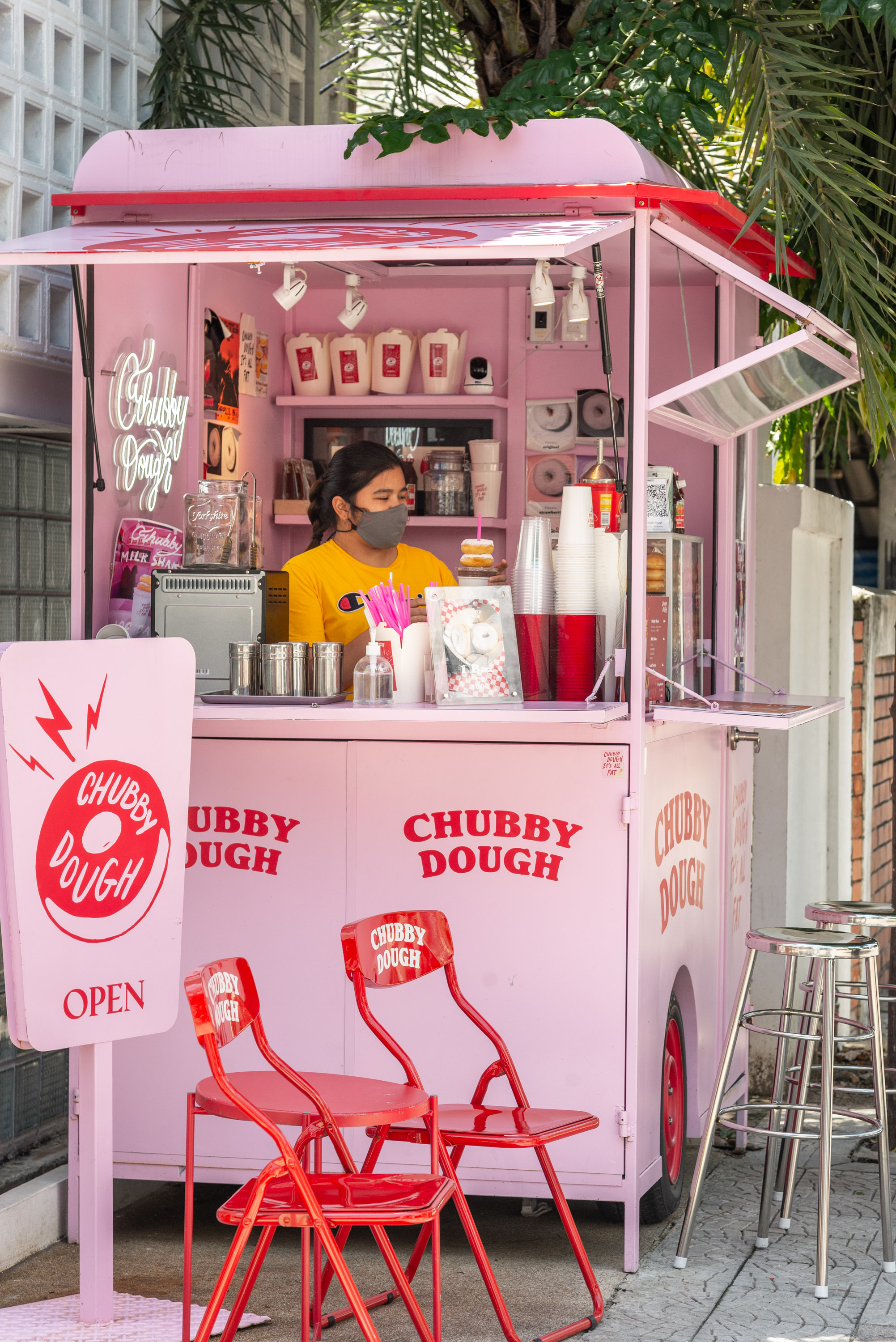 Chubby Dough ร้านโดนัทสไตล์อเมริกันสีชมพูหวานสดใส ตั้งโดดเด่นอยู่ด้านหน้าโครงการ Gump’s Ari ที่อยากชวนคุณมาทำความรู้จักกับเมนูขนมหวานและเครื่องดื่มในคอนเซ็ปต์ ‘It’s All Fat’ ที่ทีมผู้ก่อตั้งร้านมีความเชื่อว่า 'การกินขนมให้อร่อยควรลืมการไดเอทไปแบบชั่วขณะ' ซึ่งทางร้านนั้นจัดเต็มวัตถุดิบชั้นดีแบบ Full Fat พร้อมเสิร์ฟความอร่อยของเครื่องดื่มและโดนัทแสนอร่อยแบบหวานกำลังดีให้ทานกันได้เพลิน ๆ