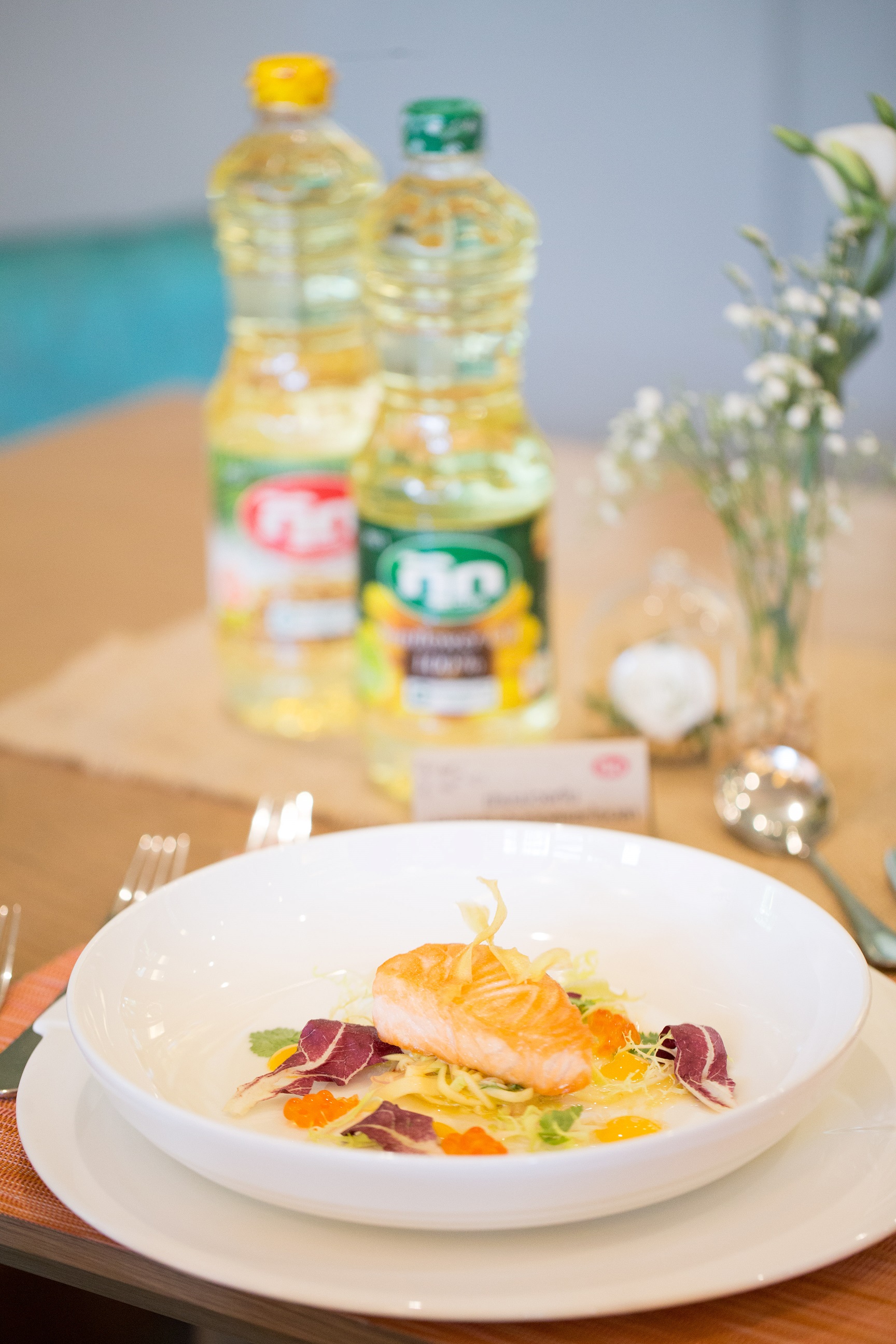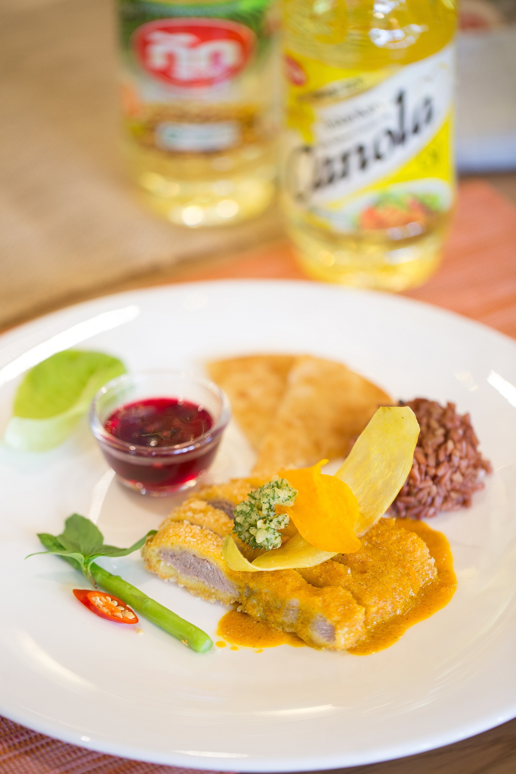 และร่วมรับประทานอาหารโดยฝีมือของเชฟวิชิต มุกุระ เจ้าของร้านอาหารข้าวที่ให้เกียรติมารังสรรค์เมนูอาหารคาวหวานจากการปรุงด้วยน้ำมันพืชกุ๊ก เริ่มต้นเมนูแรกด้วย หอยเชลล์ทอดกับซอสส้มซ่าและไข่กุ้ง ที่นำหอยเชลล์ฮอกไกโดตัวโตทอดในน้ำมันคาโนลากุ๊ก และซอสส้มซ่าที่มีส่วนผสมของน้ำมันคาโนลาผสมกับไข่แดง น้ำและผิวส้มซ่าและพริกขี้หนูแดง