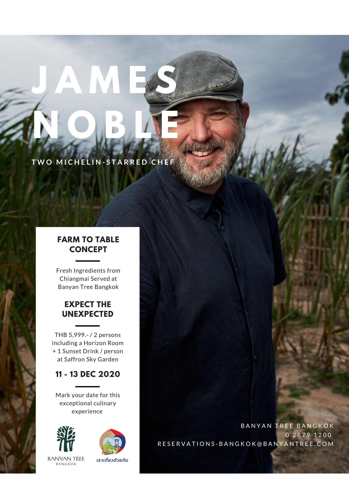 พบกับเชฟ James Noble พร้อมแพ็กเกจสุดพิเศษได้ตั้งแต่วันที่ 11-13 ธันวาคม 2563 ที่ โรงแรมบันยันทรี กรุงเทพฯ ในราคา 5,999 บาท โดยในแพ็กเกจรวมมื้อค่ำ White Menu โดย เชฟ James Noble สำหรับ 2 ท่าน (ไม่รวมเครื่องดื่ม), ห้องพักประเภท Horizon 1 คืน (ไม่รวมอาหารเช้า) และบัตรเข้าชม ฟาร์มออริจิน (Ori9in farm) ที่จังหวัดเชียงใหม่ สำหรับ 2 ท่านอีกด้วย