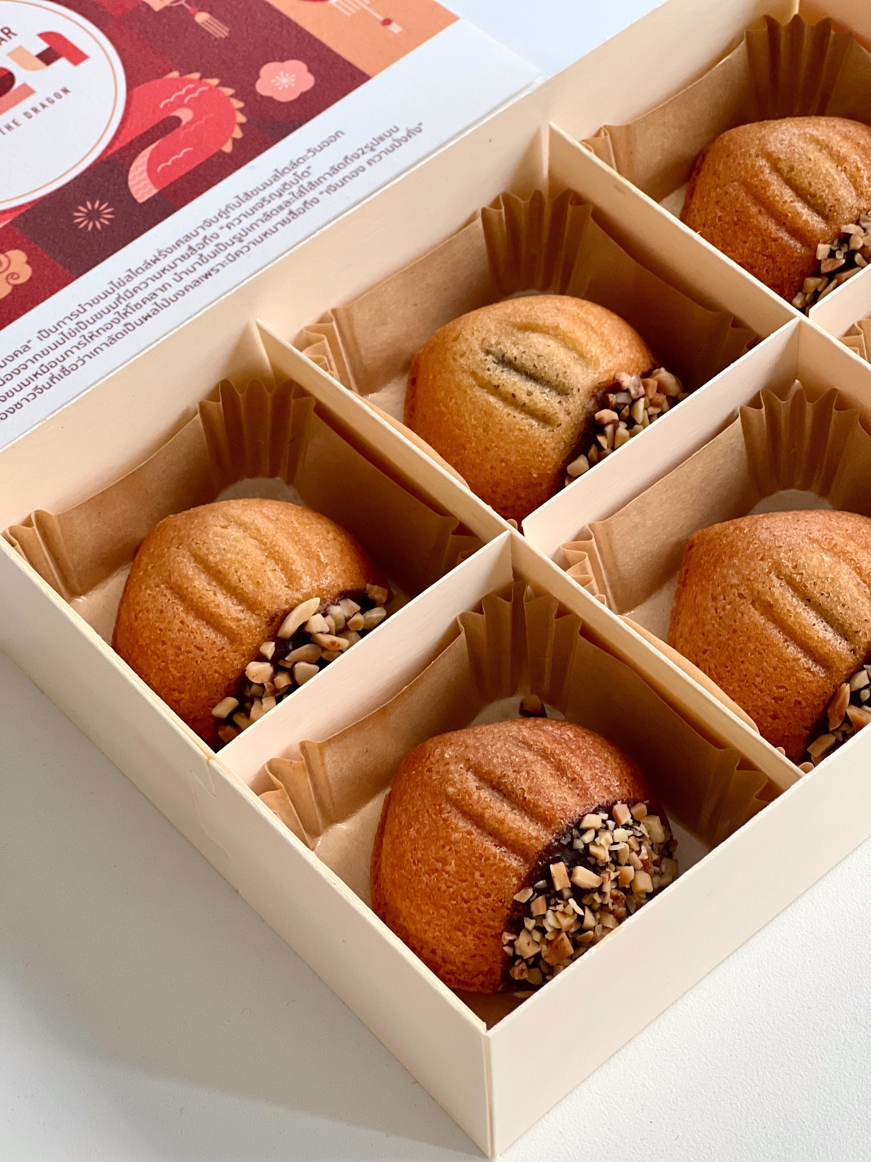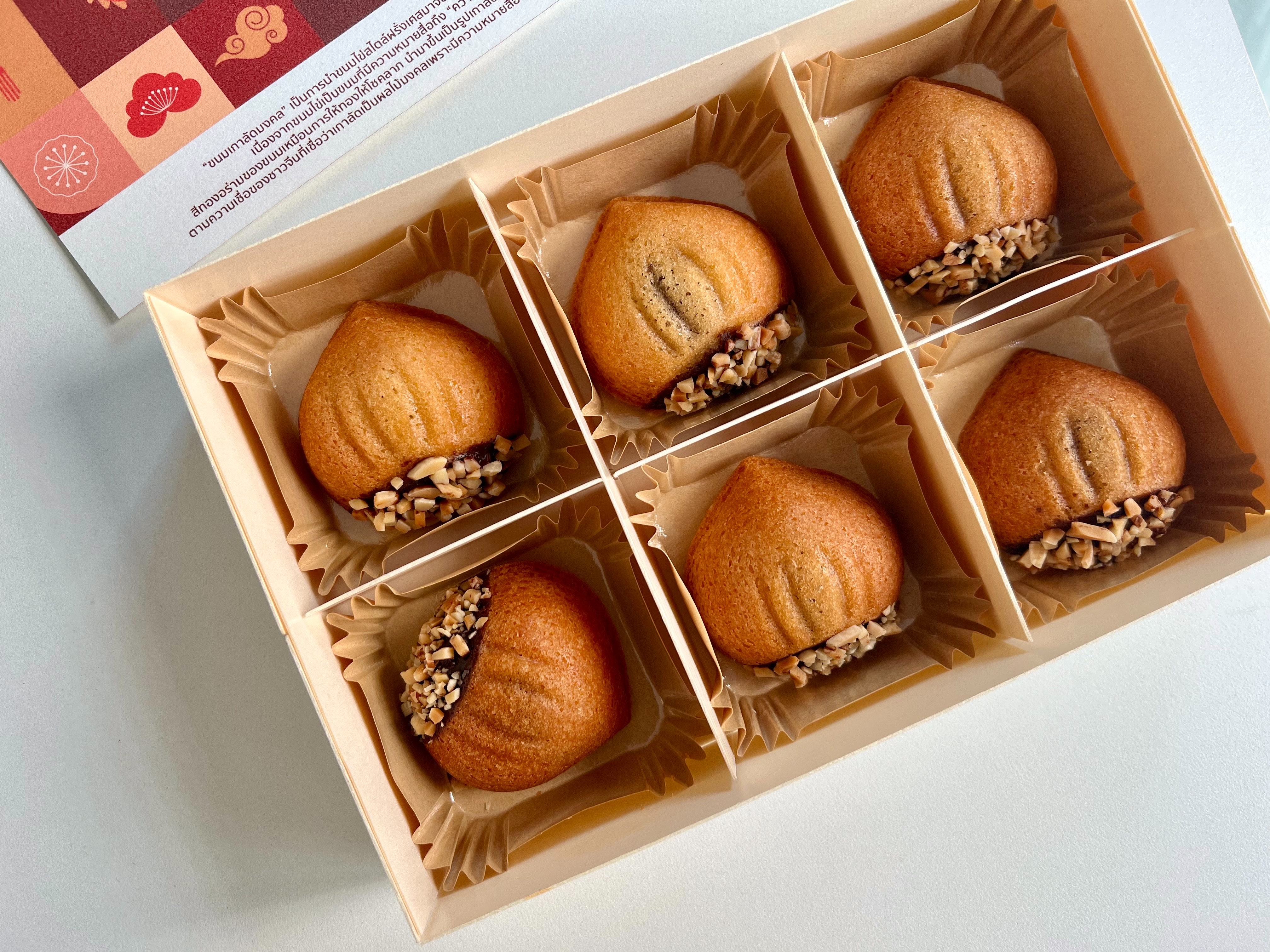 นอกจากหน้าตาที่เป็นเอกลักษณ์พิเศษที่ไม่เหมือนใครแล้ว ทางร้านยังคัดสรรวัตถุดิบคุณภาพดี ตั้งแต่การเลือกใช้เกาลัดเชื่อมคัดพิเศษนำเข้าจากประเทศญี่ปุ่น เนื้อหวานฉ่ำมีกลิ่นหอมเป็นเอกลักษณ์ นำมาหุ้มด้วยเนื้อเกาลัดกวนอีกชั้นหนึ่ง แล้วจึงนำไปใส่เป็นไส้ไว้ใน Madeleine ที่หอมไปด้วยเนยแท้จากฝรั่งเศสและฝักวนิลาจาก Madagascar เพิ่มรสสัมผัสด้วยการเคลือบด้วย Dark Chocolateและถั่ว Almond  แบบฟิน ๆ  Golden Chestnut Madeleine 1 กล่องประกอบด้วยขนมเกาลัดมงคล 6 ชิ้น ราคา 590 บาท / 1กล่อง