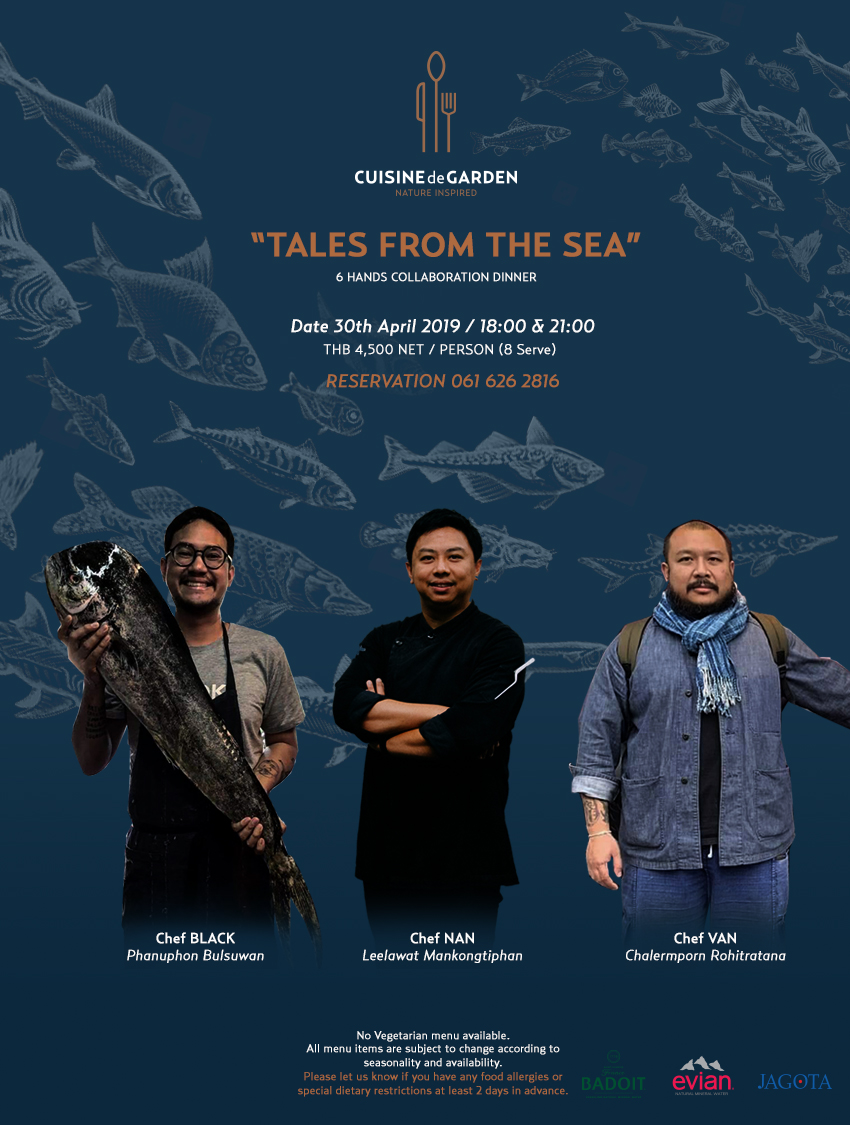 “TALES FROM THE SEA” โปรเจ็กต์พิเศษจาก Cuisine de Garden ที่ร่วม Collaboration กับเชฟทั้ง 3 คนโดยมี เชฟแวน เชฟเจ้าของร้าน DAG ร่วมกับ เชฟแบล็ก จาก Blackitch และเชฟแนน เชฟเจ้าของร้าน Cuisine de Garden จะพาทุกคนออกเรือเดินทางไปสู่ท้องทะเลไทย ผ่านเรื่องราวที่นำเสนอออกมาเป็นเมนูปลาจากท้องทะเลไทยหลากหลายชนิด ผสมผสานเทคนิคการทำอาหารที่มาจากประสบการณ์ของเชฟทั้งสามคนที่แตกต่างกัน ออกมาเป็น Course Dinner ทั้งหมด 8 เมนูภายใต้คอนเซ็ปต์ “TALES FROM THE SEA” ที่ทุก ๆ จานเหมือนได้ร่วมออกเดินทางไปพบกับกลิ่นอายความสวยงามของธรรมชาติของท้องทะเลบ้านเรา ในวันที่ 30 เมษายนนี้ เวลา 18.00 น. และ 21.00 น. ราคา 4,500 บาท (Net) ต่อท่าน