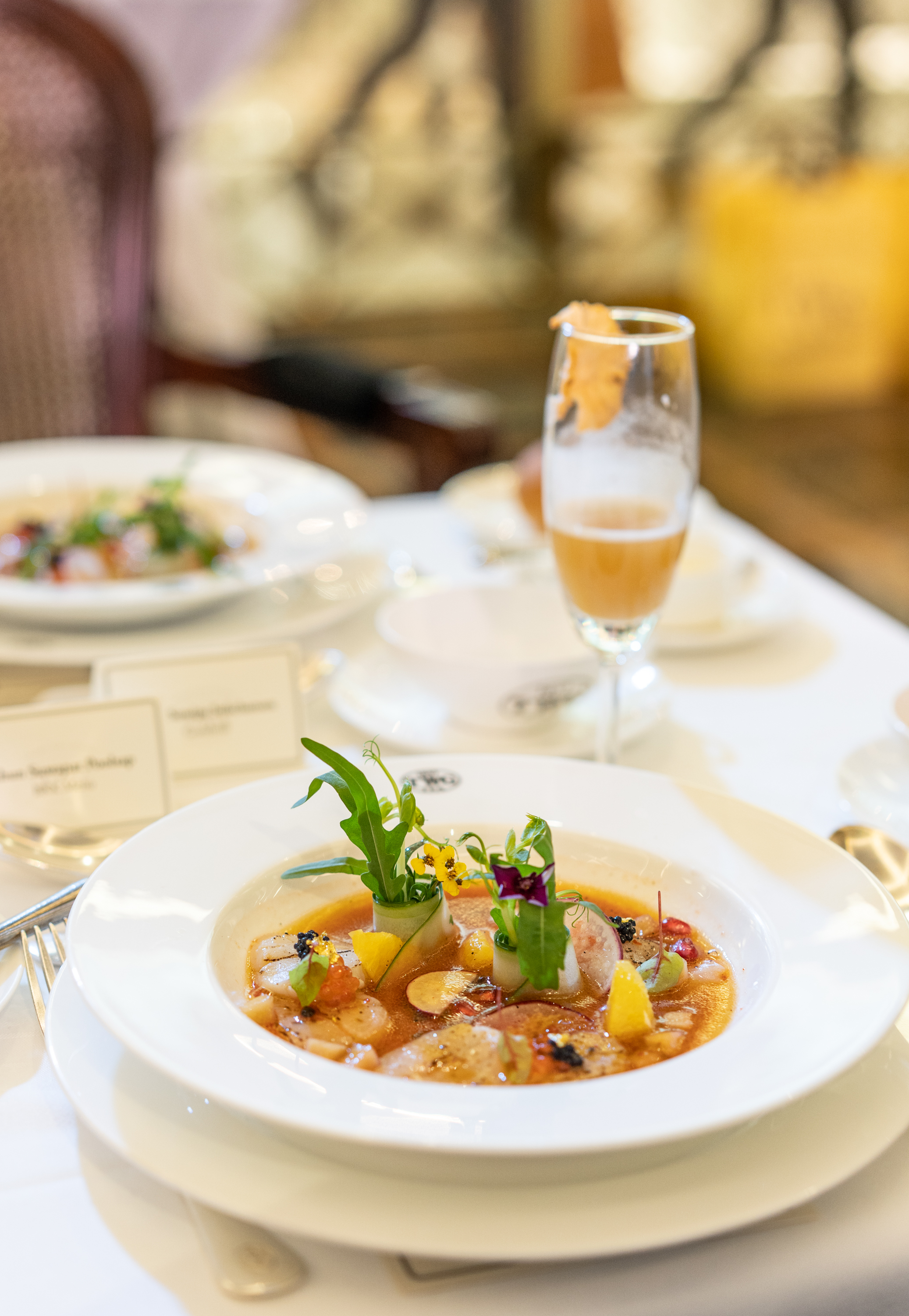 สำหรับเมนูอาหารสุดพิเศษนั้น เริ่มต้นจาก Scallop Carpaccio เป็นเมนูเรียกน้ำย่อย ที่มีส่วนผสมหลักคือหอยเชลล์ธรรมชาติสด ๆ อย่าง สแกลลอป คาร์ปาชิโอ เป็นเนื้อหอยเชลล์สดใหม่ เสิร์ฟในฮิบิคัสเดรสซิ่ง (Hibiscus Dressing) รสชาติเผ็ดนิด ๆ ผสมกับชา Jade of Africa Tea โรยหน้าด้วยพริกไทยสีชมพู ทานคู่กับ White Sky Tea ชาขาว Majestic Yin Zhen ที่ผสมดอกกระดังงาเพื่อรสชาติที่ลงตัว
