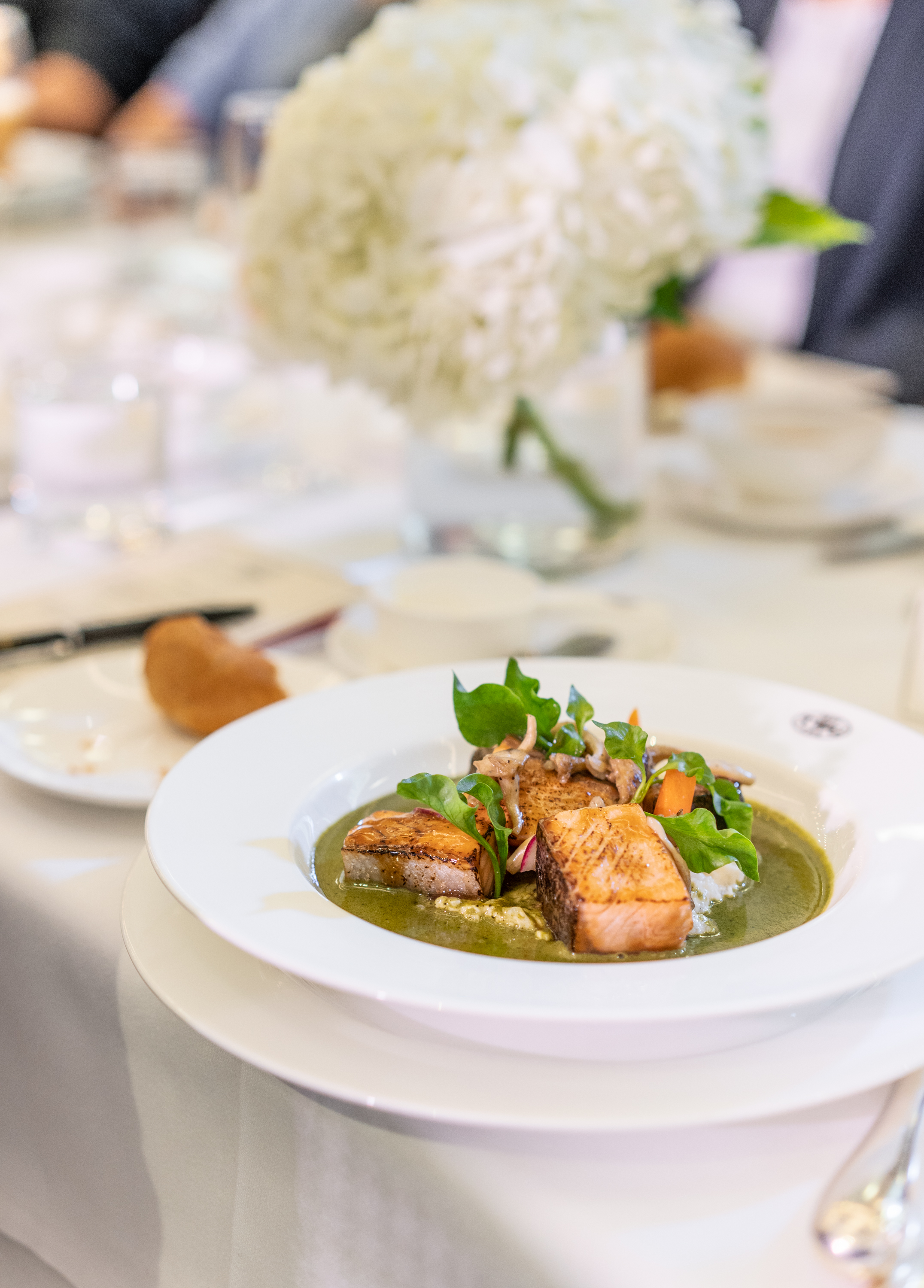 สำหรับเมนคอร์สแนะนำเป็น Norwegian Salmon & Matcha Beurre Blanc เนื้อปลาแซลมอนชุบซอสเทริยากิที่นำมาจี่ไฟอ่อน ๆ ให้พอสุก เสิร์ฟพร้อมข้าวอบกะทิ ถั่วแระญี่ปุ่น และเห็ดนางรมผัด ราดด้วยซอสเนยขาวผสมมัทฉะ ปลาแซลมอนเนื้อชุ่มฉ่ำเข้ากันได้ดีกับซอสมัทฉะสุดเข้มข้น แนะนำให้ทานคู่กับ Breakfast Queen Tea ชาเขียวที่มีรสสัมผัสและกลิ่นที่สดชื่นของมะนาวและกุหลาบเพื่อตัดความเลี่ยน