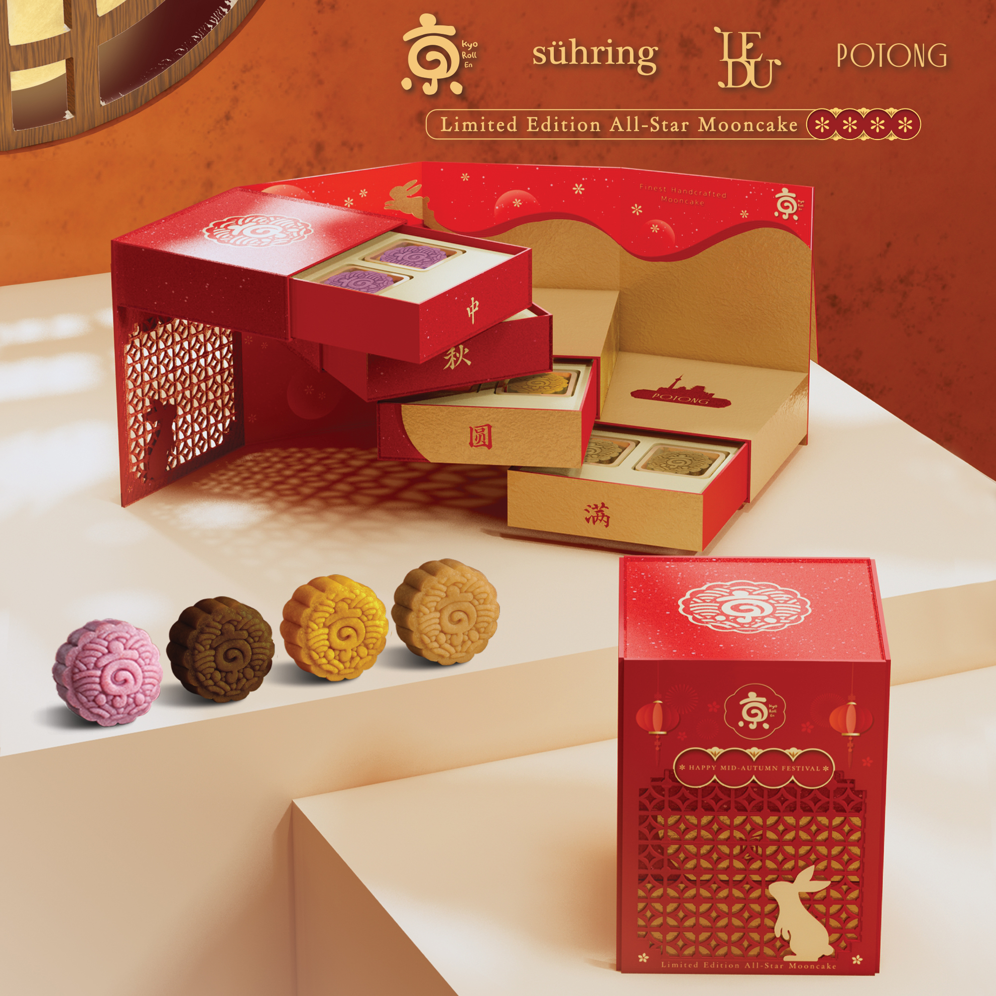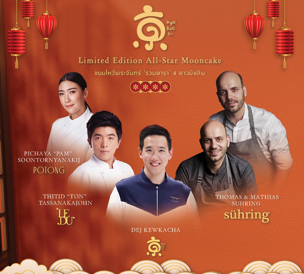 การโคจรของเหล่าเชฟมิชลินที่มาร่วมกันครีเอตความอร่อยสุดพิเศษในครั้งนี้ ประกอบด้วย เชฟเดช คิ้วคชา จาก Kyo Roll En, เชฟต้น-ธิติฏฐ์ ทัศนาขจร จากร้าน LE DU ร้านอาหารไทย 1 ดาวมิชลินแห่งแรกที่คว้าแชมป์อันดับ 1 ร้านอาหารที่ดีที่สุดใน Asia’s 50 Best Restaurant 2023 พร้อมติดอันดับสูงสุดลำดับที่ 15 ของโลก จากเวที The World’s 50 Best Restaurants 2023 ตามด้วย เชฟแพม-พิชญา สุนทรญาณกิจ จากร้าน POTONG ร้านอาหาร 1 ดาวมิชลิน แนว Progressive Thai-Chinese แห่งย่านเยาวราช ที่กำลังได้รับความนิยมและถือเป็นหนึ่งในร้านอาหารที่จองยากที่สุดในกรุงเทพฯ ณ ขณะนี้ ปิดท้ายด้วย 2 เชฟฝาแฝดชาวเยอรมัน ได้แก่ เชฟ Thomas & Mathias Suhring จากร้าน SUHRING ร้านอาหารไฟน์ไดน์นิ่งเยอรมันร่วมสมัย 2 ดาวมิชลิน ที่ทำอันดับสูงสุดในไทย และติดอันดับ Asia’s 50 Best Restaurants 7 ปีซ้อน ความพิเศษของ Limited Edition All-Star Mooncake ที่ทาง Kyo Roll En เลือกนำเสนอความอร่อยในปีนี้ เรียกว่าเป็นการรวมดารา รวมความอร่อยของขนมไหว้พระจันทร์จาก 4 ร้าน 4 ดาว 4 รสชาติ และ 4 สัญชาติ ในแบบฉบับไทย-จีน-ญี่ปุ่น-เยอรมัน ซึ่งแต่ละรสชาติ เชฟต่างได้แรงบันดาลใจมาจากขนมที่แต่ละคนชื่นชอบและเป็นขนมที่ขึ้นชื่อจากทั้ง 4 ประเทศ โดยนำมารังสรรค์ดัดแปลงตามสไตล์ของเชฟจนออกมาในรูปแบบขนมไหว้พระจันทร์ที่มีรสชาติเป็นเอกลักษณ์ด้วยการสร้างสรรค์ผ่านวัตถุดิบชั้นเลิศ อาทิ