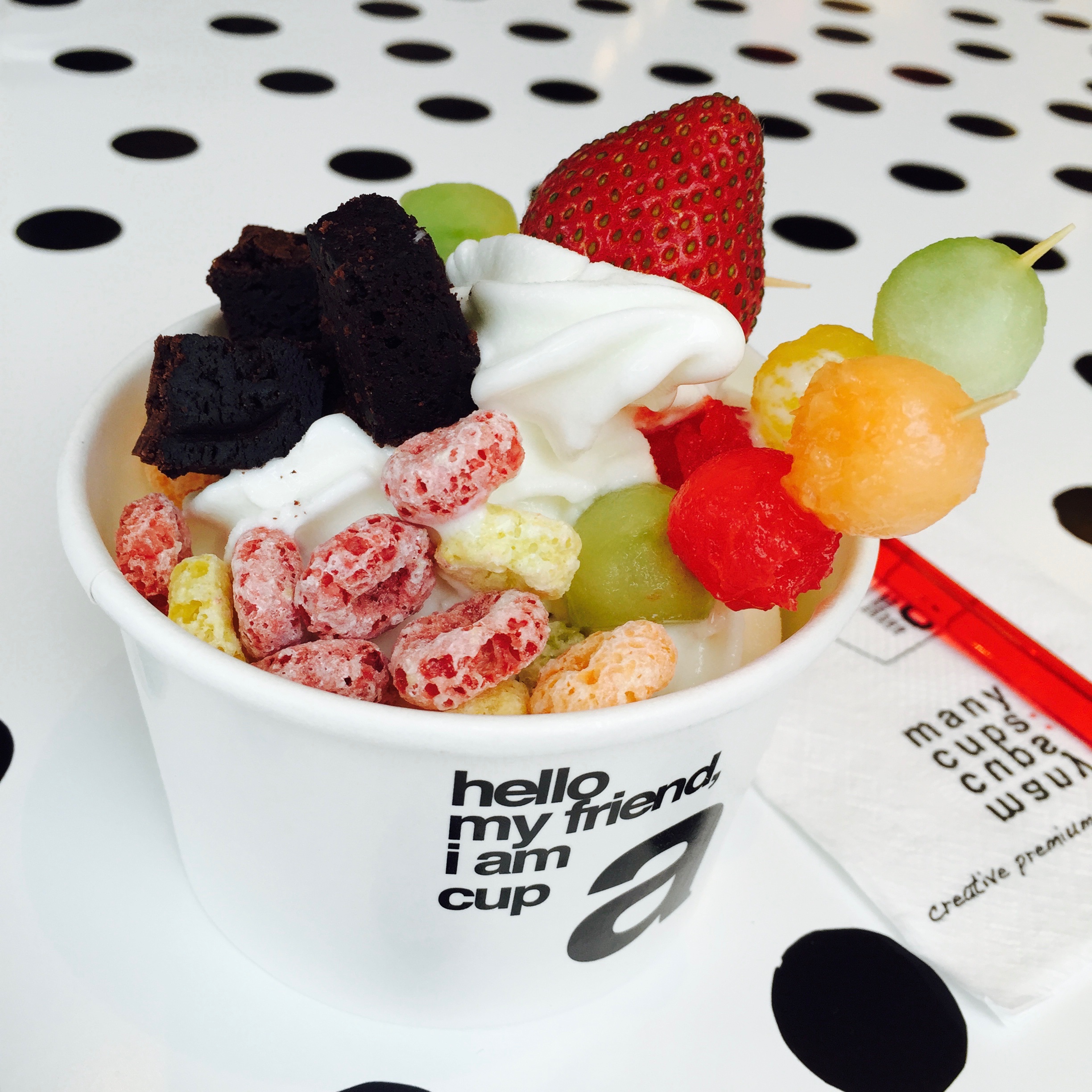 มาพร้อมกับท็อปปิ้งอีกกว่า 60 ชนิด รวมถึงผลไม้สดแช่เย็นประจำวัน หัวใจหลักของโฟรเซ่นโยเกิร์ตของทางร้านเมนี่คัพส์: อยู่ที่การผลิตแบบโฮมเมด ความลับอยู่ที่ ‘ออร์แกนิกโยเกิร์ต’ สูตรเฉพาะ ซึ่งผลิตจากน้ำนมของแม่วัวที่เลี้ยงในฟาร์มเปิด ไม่ใช้สารเคมีในการเลี้ยง ถูกรักษาในอุณภูมิที่เหมาะสม เพื่อสร้างและรักษาจุลินทรีย์ชนิดดี ซึ่งไอศกรีมทุกรสชาตินั้น จะถูกผลิตครั้งละน้อย ๆ เพื่อความสดใหม่ตลอดเวลาเพื่อคงคุณประโยชน์ของจุลินทรีย์ชนิดดีไว้ครบถ้วน