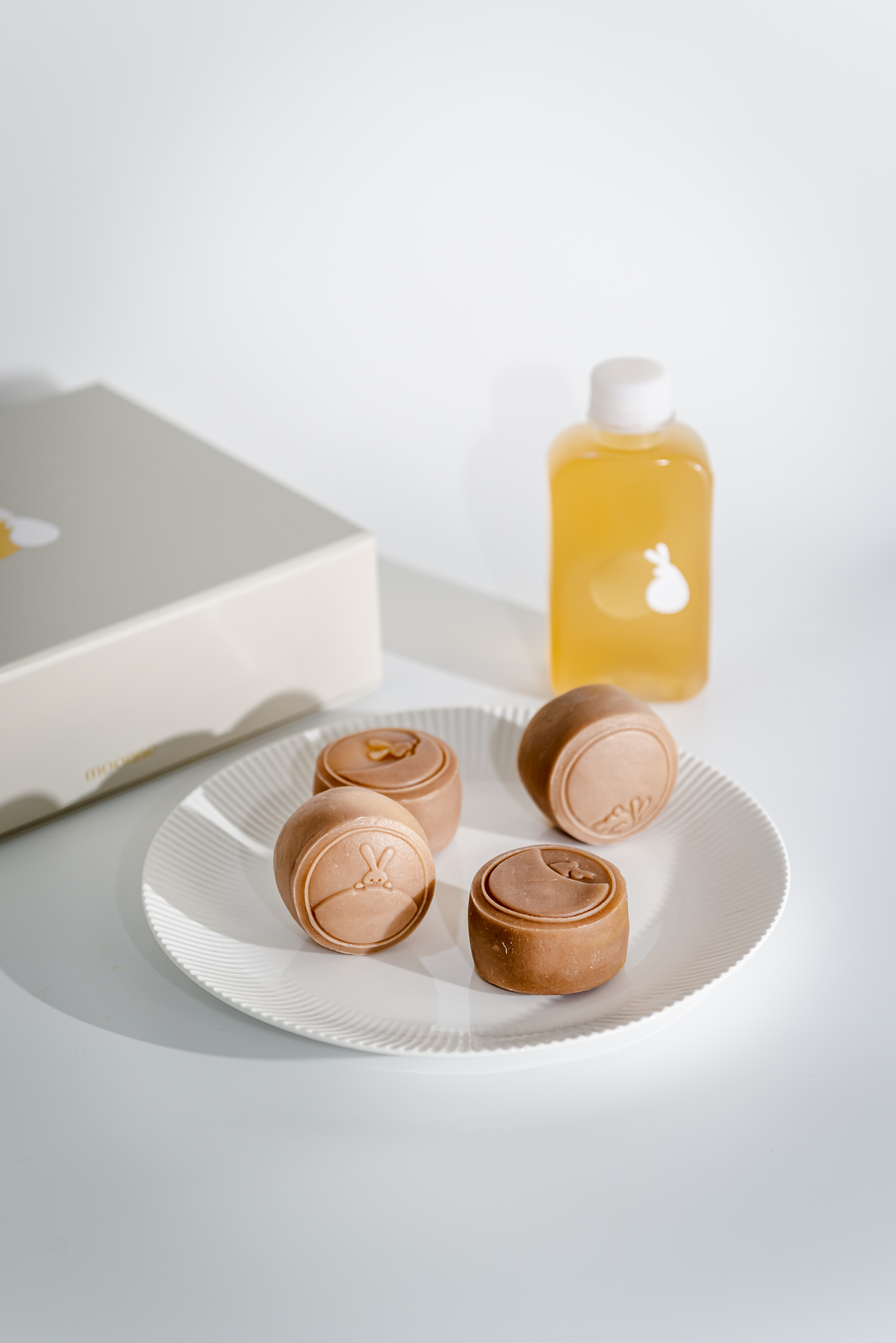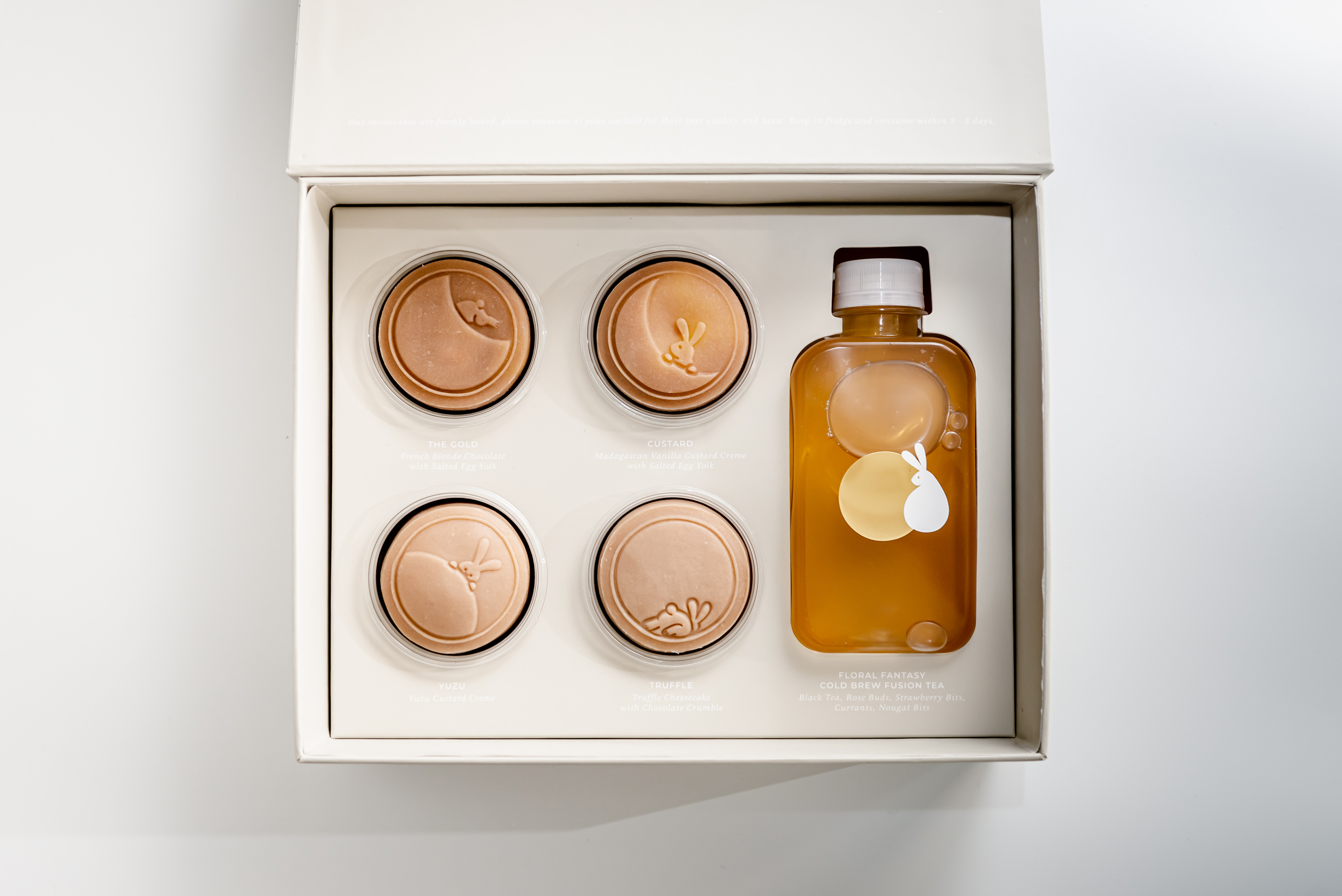 ขนมไหว้พระจันทร์ 4 รสชาติ บรรจุมาพร้อมชาโคลด์บรูว์ 1 ขวด ภายในกล่องแพ็คเกจจิ้งดีไซน์สุดมินิมัล