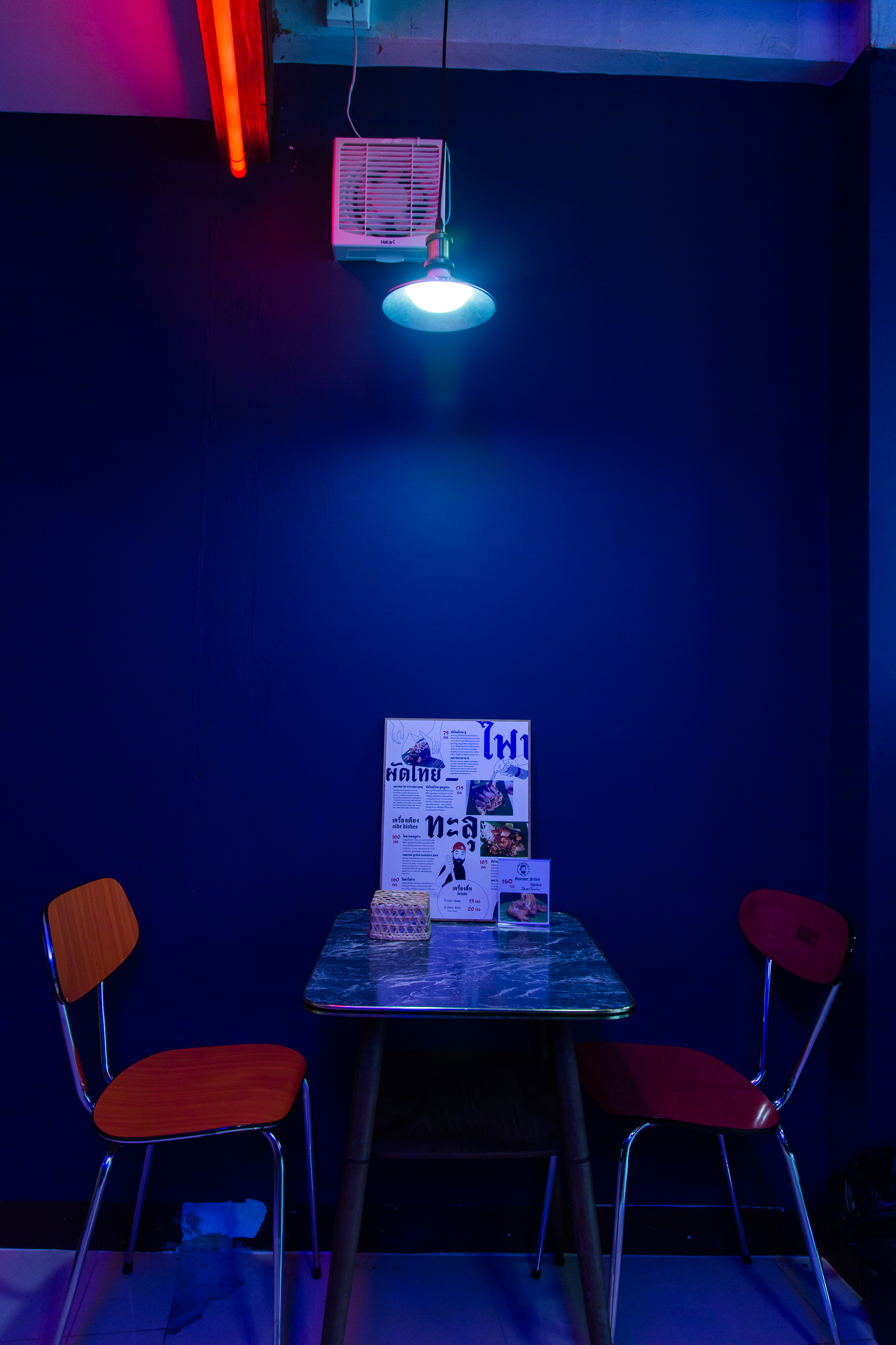 ในส่วนของบรรยากาศร้าน ทางร้านมีทั้งหมด 2 ชั้น เมื่อเดินเข้าด้านใน ชั้นล่างจะเห็นรถเข็นตั้งอยู่บริเวณหน้าร้านพร้อมควันโขมงจาง ๆ จากการทำผัดไทย ส่วนชั้นบนถูกตกแต่งด้วยไฟนีออนหลากสีที่เพิ่มความชิคให้กับตัวร้านได้ไม่น้อย นอกจากนี้ยังสร้างสรรค์บรรยากาศสุดครึกครื้นด้วยการเปิดเพลงหมอลำสนุก ๆ ที่มีการผสมผสานกับแนวเพลงฮิปฮอปได้เข้ากันดีทีเดียว