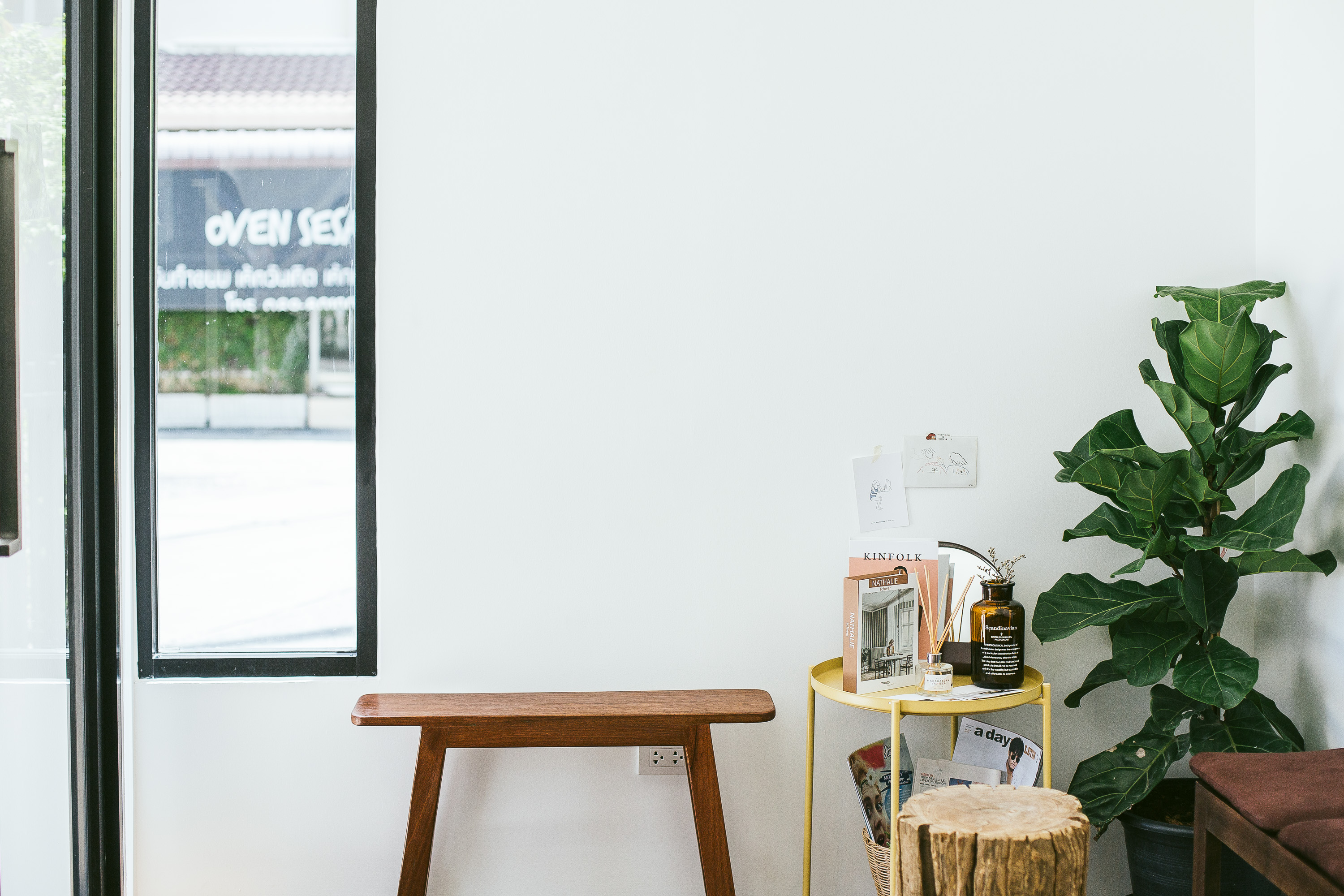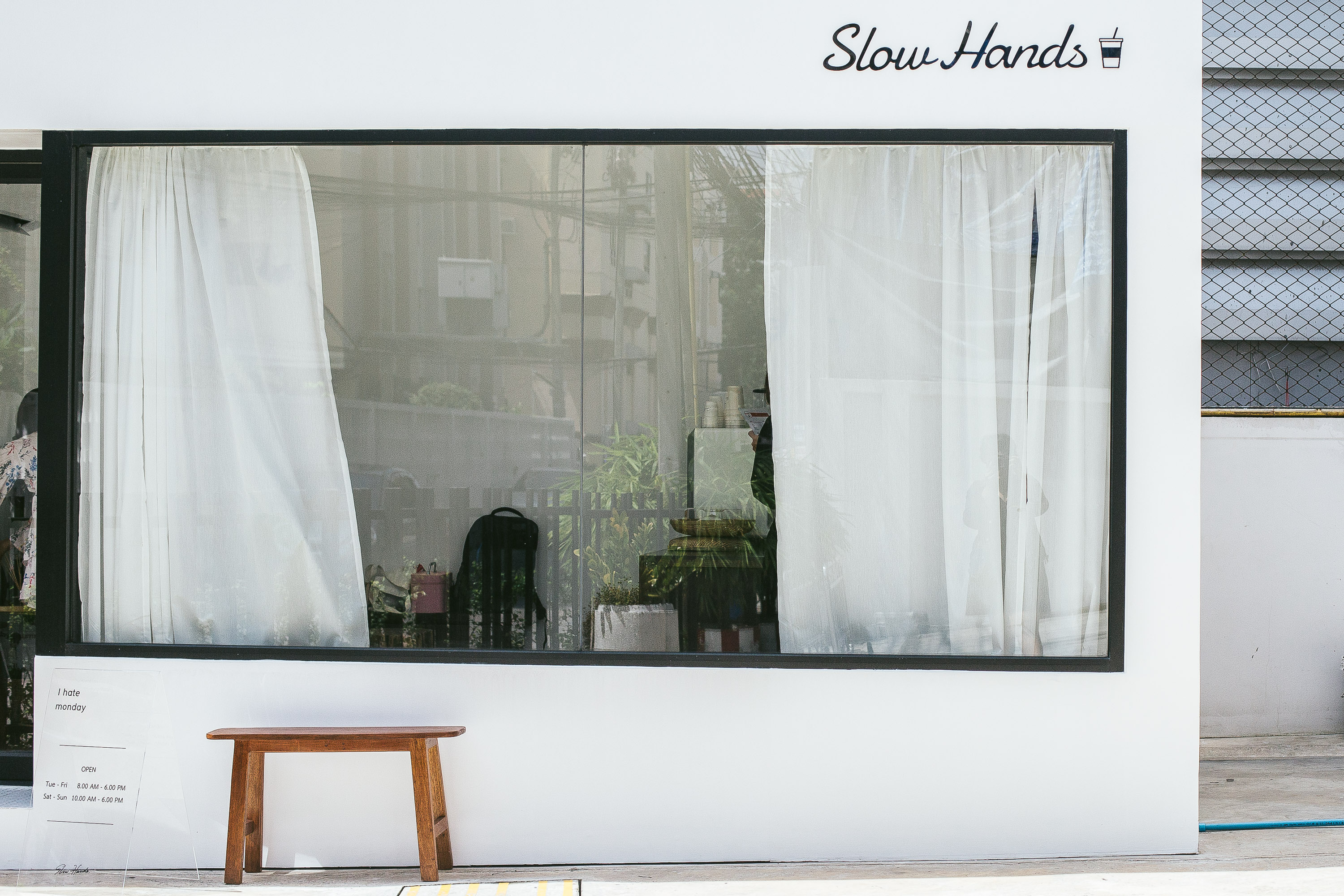 Slowhand Cafe โดดเด่นด้วยสถาปัตยกรรมสีขาวขนาดกะทัดรัดโดดเด่นอยู่กลางซอย ตกแต่งสไตล์มินิมอลตามพื้นที่จำกัด และแสงแดดอ่อน ๆ ที่ส่องผ่านกระจกบานใหญ่เข้ามา เสียงเพลงที่เปิดคลอเบา ๆ ผ่านเครื่องเล่นดีไซน์มินิมอลที่หมุนวนอยู่บนผนัง ไม้ประดับสีเขียวสบายตาช่วยสร้างสรรค์ให้พื้นที่แห่งนี้มีชีวิตชีวามากขึ้น