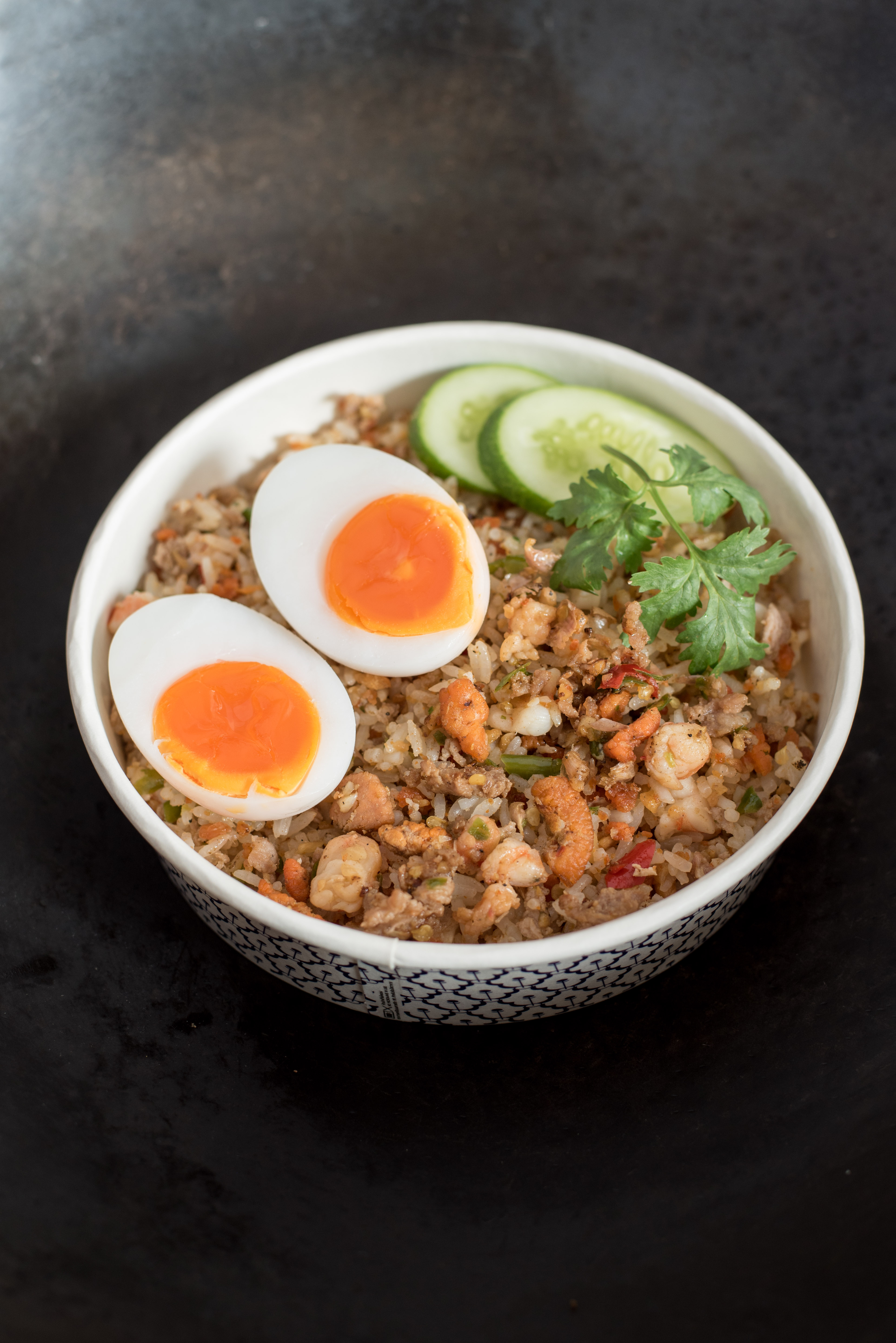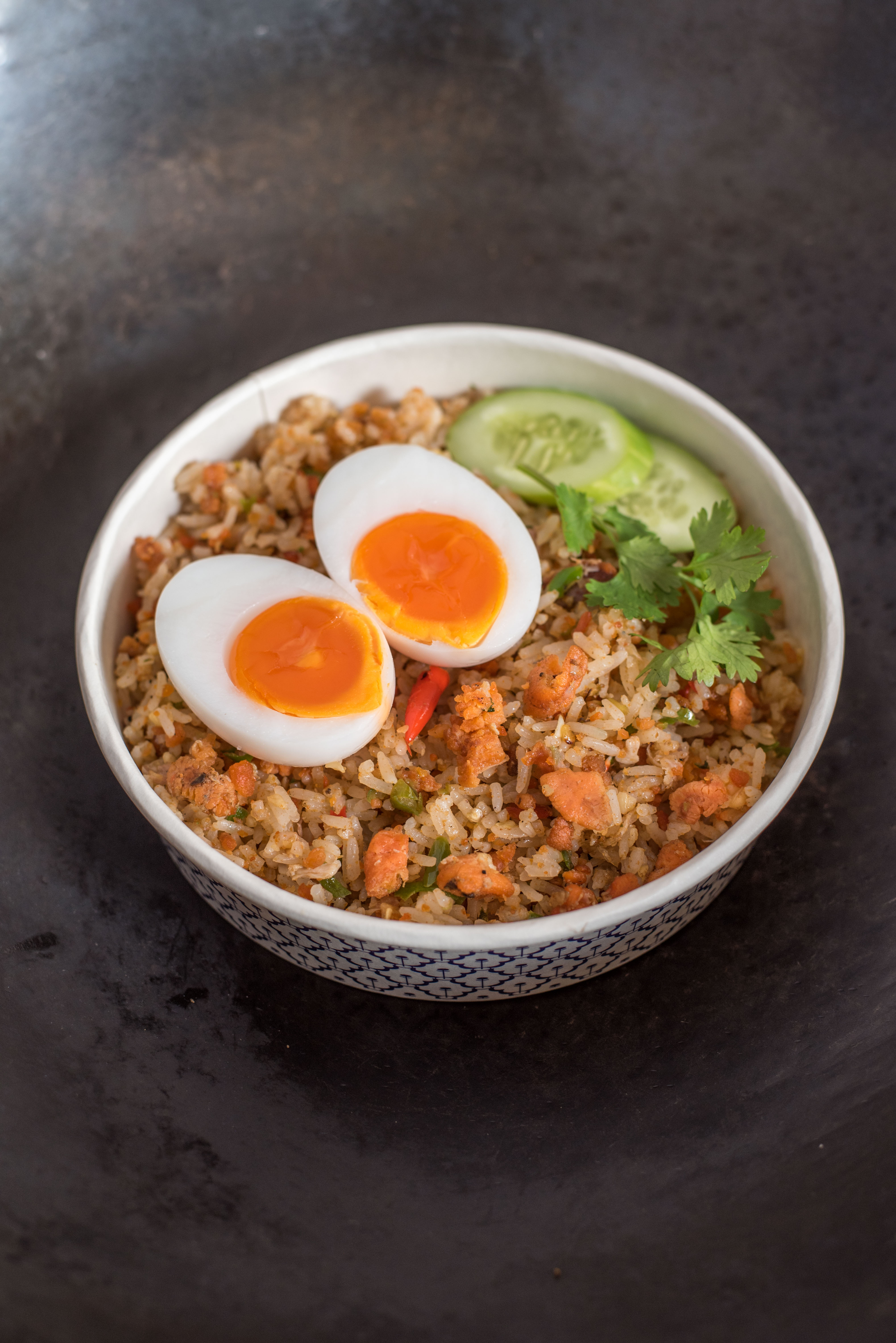 ไข่ปูคั่วพริกเกลือผัดข้าว ไข่เป็ดต้ม (Photo by Sood Kua)