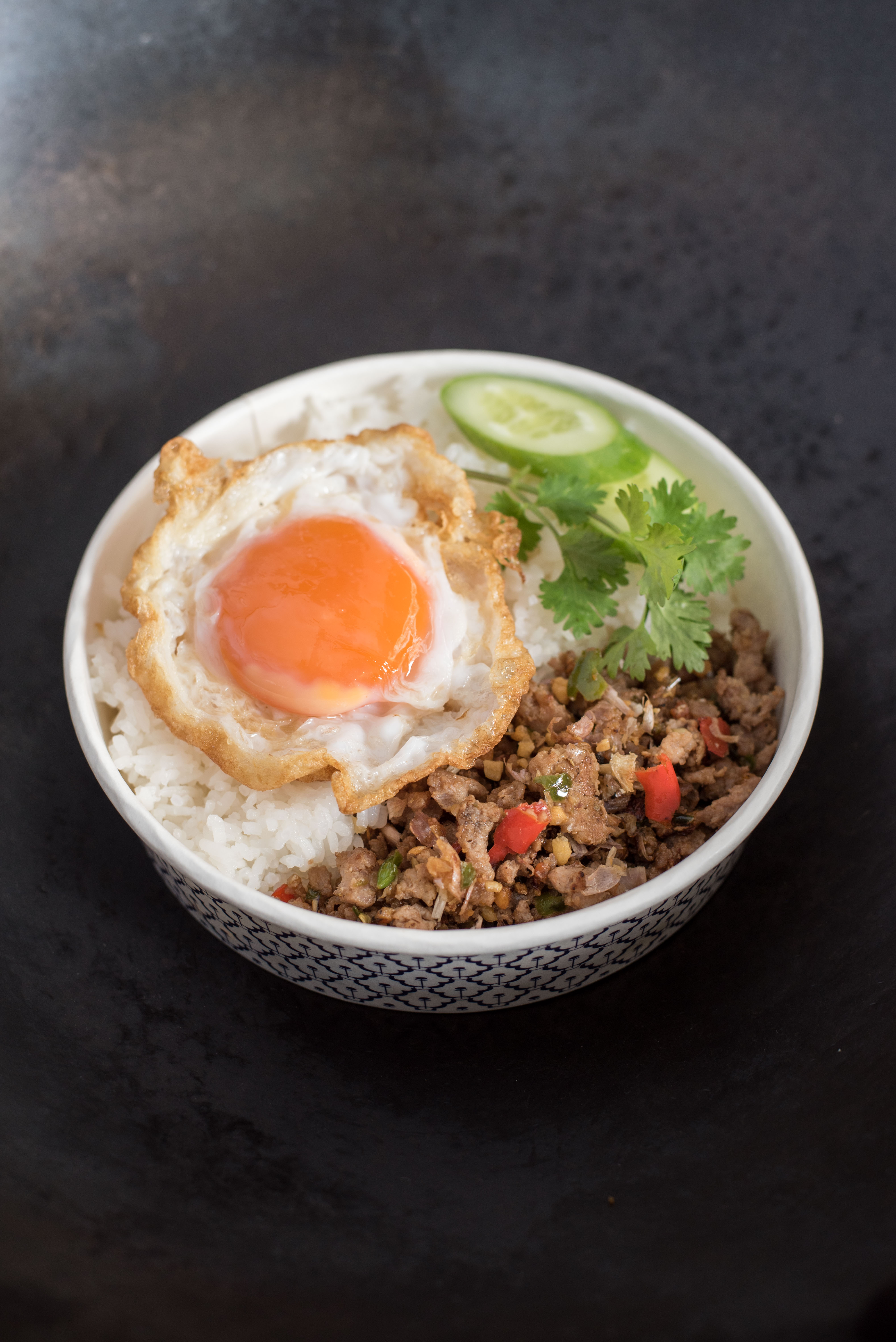หมูสับผัดพริกเกลือราดข้าว (Photo by Sood Kua)