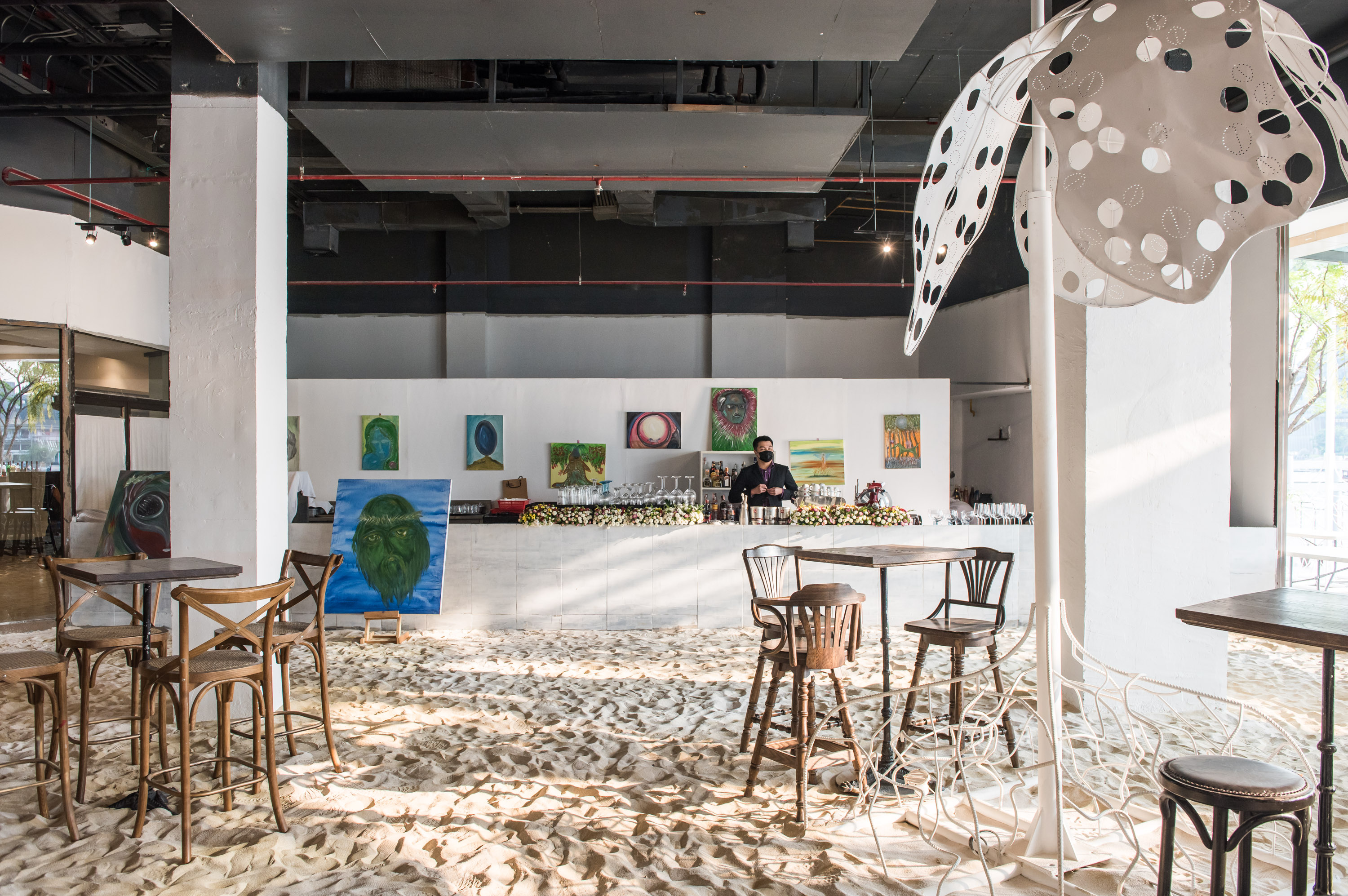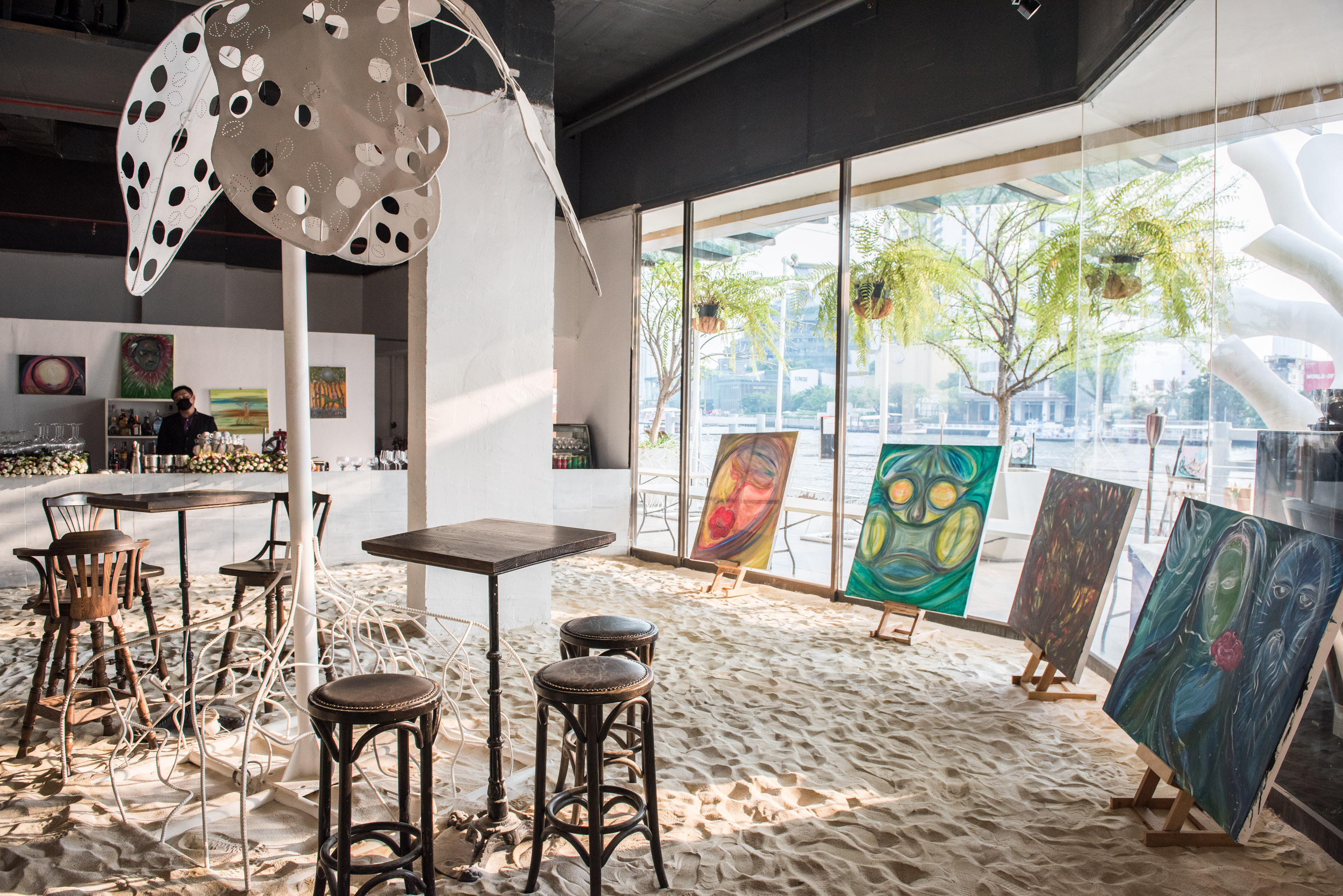 ใครที่มาถึงแล้ว จะสามารถสัมผัสได้ถึงบรรยากาศสุดชิลล์ที่เต็มไปด้วยกลิ่นอายของชายทะเล ตั้งแต่พื้นทรายนุ่ม ๆ ที่ถูกนำมาตกแต่งภายในร้าน ตลอดจนบาร์เครื่องดื่มสีขาวและเฟอร์นิเจอร์ไม้สีเข้มที่ให้ความรู้สึกเรียบง่ายคล้ายเป็นแคนวาสไว้คอยต้อนรับสีสันและลวดลายของผลงานศิลปะที่จะถูกหมุนเวียนนำมาจัดแสดงอยู่เรื่อย ๆ