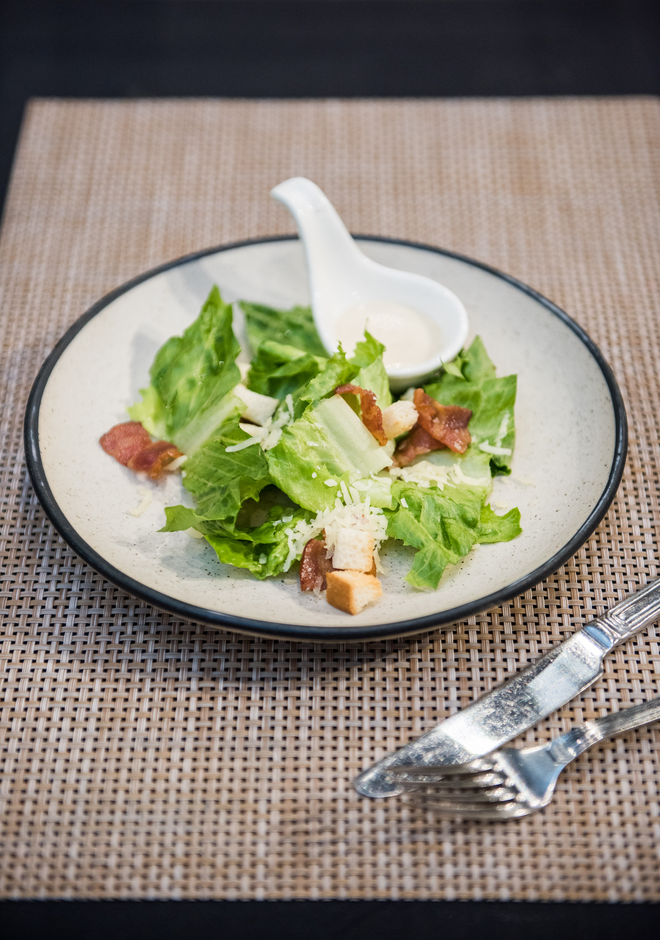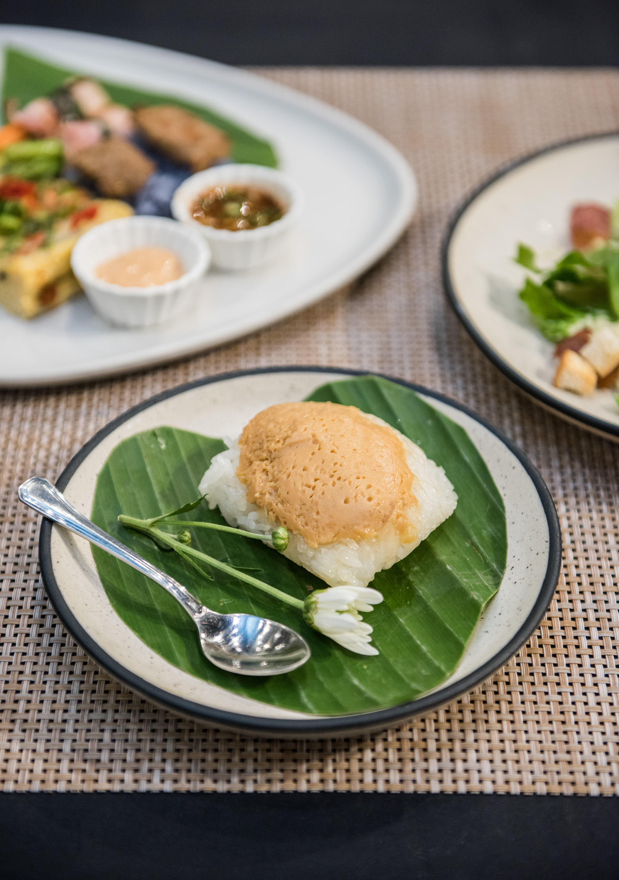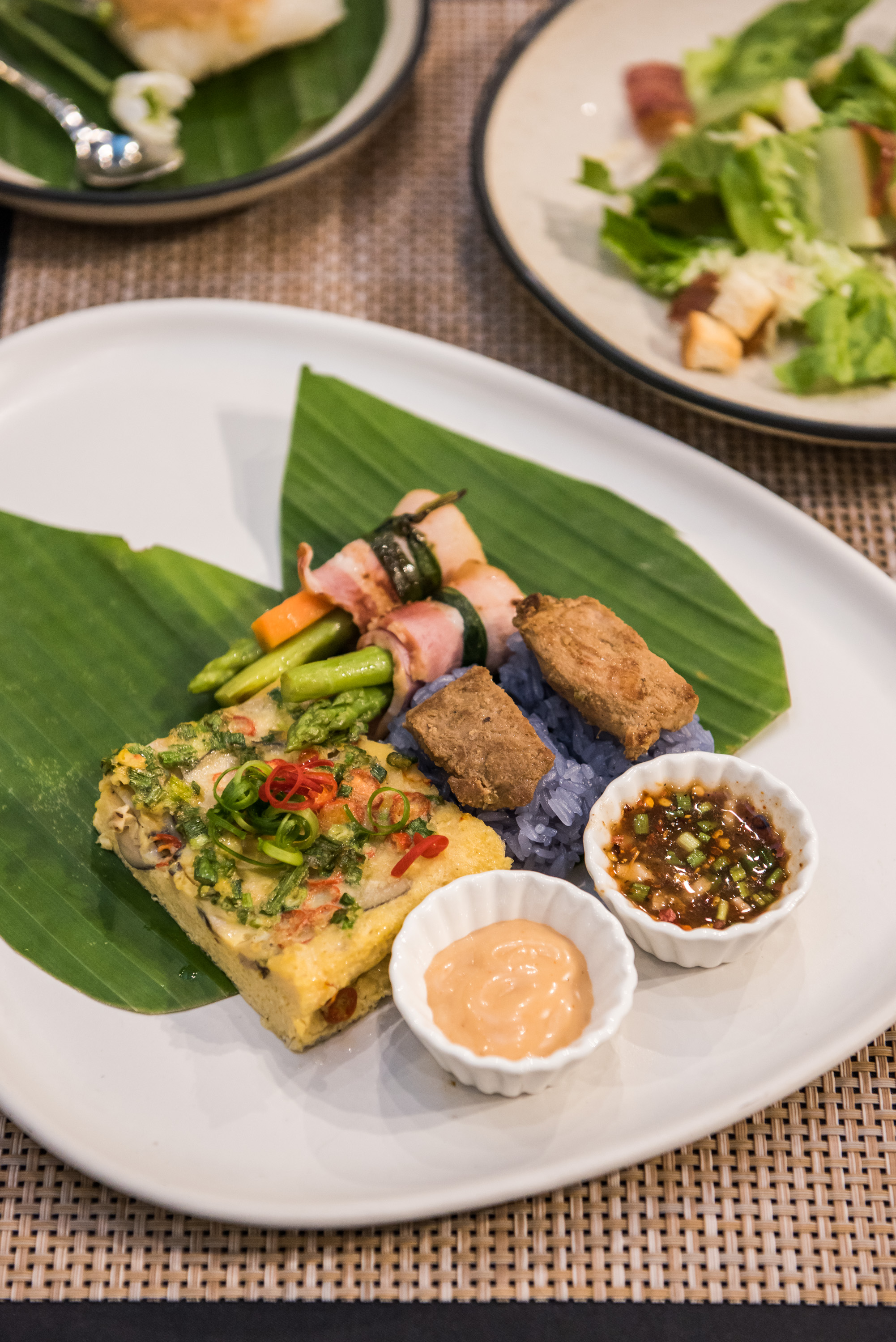 ส่วนใครที่มองหามื้อดินเนอร์เติมพลังหลังจากสนุกกับกิจกรรมเพ้นต์รูปแล้ว ลองเดินออกมานั่งทานอาหารพร้อมรับลมบริเวณเอาต์ดอร์ที่สามารถชมวิวสวย ๆ ของแม่น้ำในช่วงพระอาทิตย์ตกกันได้ อาหารของที่นี่จะเป็นสไตล์ไทยฟิวชัน มีเมนูหลากหลายให้เลือกสั่ง สำหรับครั้งนี้ทางร้านแนะนำให้รองท้องด้วย Caesar salad เมนูสลัดยอดนิยมที่ใช้ผัก Romaine Lettuce สดกรอบ โรยหน้าด้วยขนมปังกรอบ, เบคอน และชีส ก่อนจะคลุกเคล้าด้วยน้ำสลัดรสเข้มข้น ตามด้วยจาน Main course charcoal platter พร้อมเสิร์ฟหลากหลายเมนูไฮไลต์ของทางร้านให้ได้ลองทานกัน เสิร์ฟมาอย่างสวยงามบนใบตอง อย่าง ข้าวเหนียวหมูปิ้ง ทางร้านใช้ข้าวเหนียวผสมกับน้ำดอกอัญชัน เสิร์ฟพร้อมเนื้อหมูปิ้งชิ้นพอดีคำ และน้ำจิ้มแจ่วรสแซ่บ ต่อด้วย ไข่ป่าม เมนูจานไข่ยอดนิยมจากทางภาคเหนือที่จัดเต็มด้วยท็อปปิ้งหลายชนิด และ เบคอนห่อหน่อไม้ฝรั่ง หน่อไม้ฝรั่งและแครอทห่อด้วยเบคอนชิ้นใหญ่ ก่อนนำไปย่างบนเตาถ่าน ได้รสสัมผัสกรอบ ๆ จากหน่อไม้ฝรั่งและความนุ่มจากเนื้อเบคอน ปิดท้ายด้วยเมนูขนมหวานสไตล์ไทย ข้าวเหนียวสังขยา ข้าวเหนียวมูนนุ่ม ๆ หอมมันด้วยกะทิสด ท็อปหน้ามาด้วยสังขยารสหวานกำลังดี แนะนำให้ตักทานพร้อมกันจะได้รสสัมผัสที่พอดีและเข้ากันทุกเมนูอาหาร สามารถสั่งไวน์มาจิบพร้อมกันได้ ที่นี่มีไวน์ลิสต์หลากหลายให้เลือกดื่มได้ตามใจ