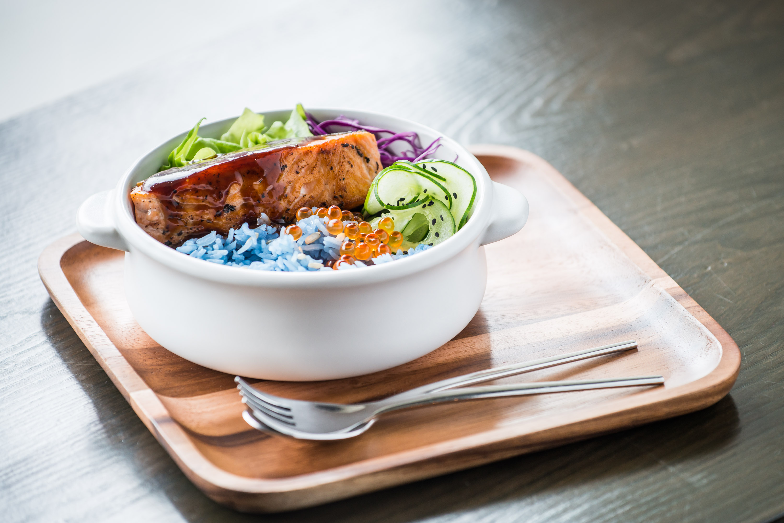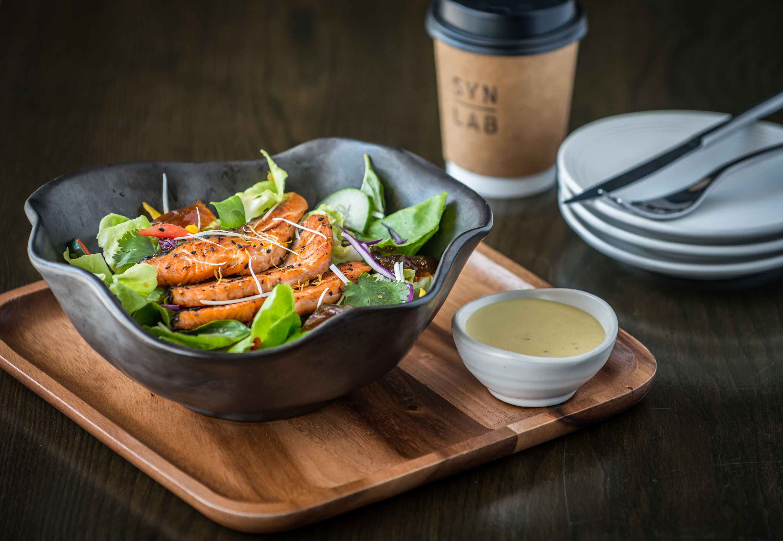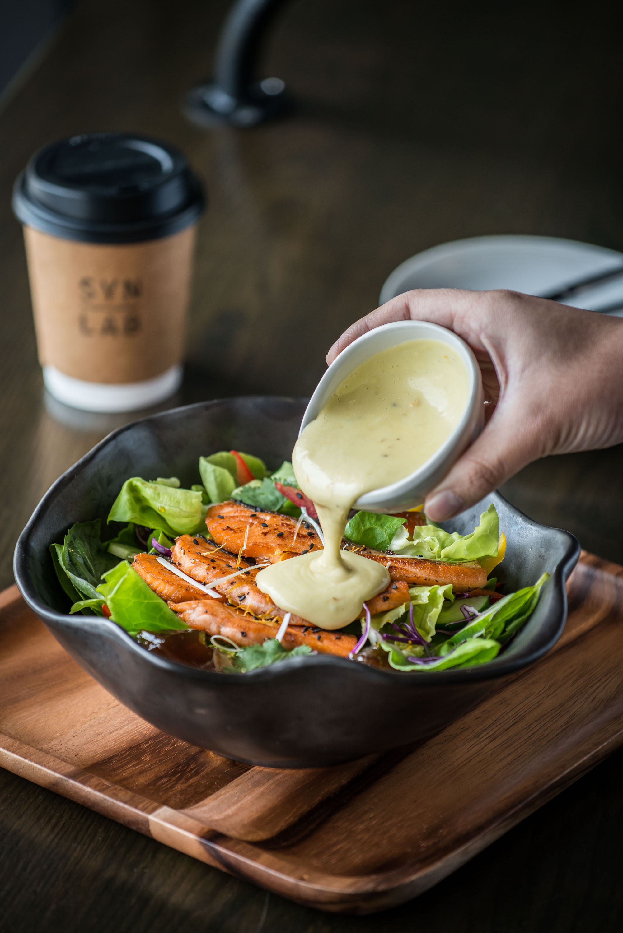 SYN LAB นับเป็นคาเฟ่แห่งแรกภายใต้การดูแลของแบรนด์ SYNOVA ผู้เชี่ยวชาญด้านการผลิตและจัดจำหน่าย เครื่องดื่มและเบเกอรี่คุณภาพระดับพรีเมียม ที่ได้ทดลองหาไอเดีย และครีเอทมาเป็นเมนูใหม่ ๆ ผ่านการใช้ผลิตภัณฑ์ของ SYNOVA อาทิ ขนมปัง ขนมอบหลากชนิด ซอส ไซรัป ไอศกรีม เค้ก และกาแฟคั่ว โดยเปิดโอกาสให้เจ้าของคาเฟ่และร้านอาหารได้เข้ามาขอคำปรึกษา ทดลองเมนูใหม่ ๆ จากวัตถุดิบที่ทางแบรนด์เป็นผู้ผลิต แล้วนำไอเดียที่ได้รับไปต่อยอดให้กับธุรกิจตัวเอง อีกทั้งลูกค้าทั่วไปยังสามารถแวะมาเช็คอิน สั่งเมนูต่าง ๆ มาทาน รวมถึงช้อปสินค้ากลับไปครีเอทเมนูสนุก ๆ ที่บ้านได้ (สำหรับผู้ประกอบการหรือเจ้าของธุรกิจที่สนใจสามารถสั่งซื้อวัตถุดิบสินค้าทางออนไลน์ได้ตลอด 24 ชั่วโมง ทาง www.synova.biz) ซึ่งในส่วนของบรรยากาศภายในก็ยังคงสอดคล้องกับชื่อคาเฟ่ที่เน้นตกแต่งภายใต้คอนเซ็ปต์ห้องทดลอง แบบสไตล์ Industrial Loft ให้ลุคเท่ ๆ มาพร้อมของตกแต่งอย่างหลอดทดลอง บีกเกอร์ รวมไปถึงของที่ใช้ในห้องทดลองที่วางประดับอยู่ตามมุมต่าง ๆ นอกจากนี้บริเวณด้านข้างยังมีห้องจัดกิจกรรมเวิร์คช็อปเพื่อให้ผู้ประกอบการได้แลกเปลี่ยนความรู้กันอีกด้วย ทำความรู้จักกับคาเฟ่กันแล้ว มาถึงเรื่องเมนูต่าง ๆ ของทางร้านกันบ้าง แต่เดิมที่นี่เสิร์ฟเพียงเมนูเครื่องดื่ม เมนูขนม เมนูของว่างทานง่าย ซึ่งก่อนหน้านี้เคยได้นำเสนอเมนูไฮไลท์ไปบ้างแล้ว (สามารถติดตามอ่านเพิ่มเติมได้ที่ We Review) โดยทุกเมนูล้วนครีเอทโดยใช้ผลิตภัณฑ์ของ SYNOVA เป็นวัตถุดิบหลัก ทำให้มั่นใจในเรื่องของคุณภาพวัตถุดิบที่ดีในระดับพรีเมี่ยม และเพื่อความหลากหลายของเมนูภายในร้าน พร้อมเพิ่มทางเลือกใหม่สำหรับใครที่กำลังมองหาเมนูอิ่มท้อง เดือนมกราคมนี้ SYN LAB จึงเสริมทัพด้วย 11 เมนูใหม่ที่นำเสนอในธีมอาหารเพื่อสุขภาพ ไขมันน้อย เสริมโปรตีน-ใยอาหารให้มากขึ้น เน้นวัตถุดิบจากธรรมชาติ และให้สีสันสวยงามน่าทาน แต่ละเมนูครีเอทออกมาในสไตล์ Fusion-Asian ที่ผสมผสานกันระหว่างอาหารไทย อาหารอิตาเลียน กับกลิ่นอายของอาหารแนวเอเชี่ยนอย่างเกาหลีและญี่ปุ่นเข้าไว้ด้วยกันอย่างลงตัว สำหรับเมนูอาหารที่ทาง SYN LAB ได้ครีเอทขึ้นมาใหม่ แบ่งออกเป็น 3 ประเภทหลัก ๆ ได้แก่ เมนูสลัด เมนูพาสต้า และเมนูข้าว โดยมี 5 เมนูไฮไลท์ที่พลาดไม่ได้ ดังนี้ เริ่มต้นกันด้วยเมนูสลัดเพื่อคนรักสุขภาพโดยเฉพาะกับ Yuzu Wasabi Salmon Salad with Ponzu Jelly (265 บาท) สลัดแซลมอนสไตล์ไทย-ญี่ปุ่น ซึ่งมีความพิเศษอยู่ที่การเลือกใช้ผักสลัด 5 สี และน้ำสลัดที่ให้กลิ่นวาซาบิบาง ๆ ผสานกลิ่นหอมสดชื่นของส้มยูซุที่ส่งตรงจ