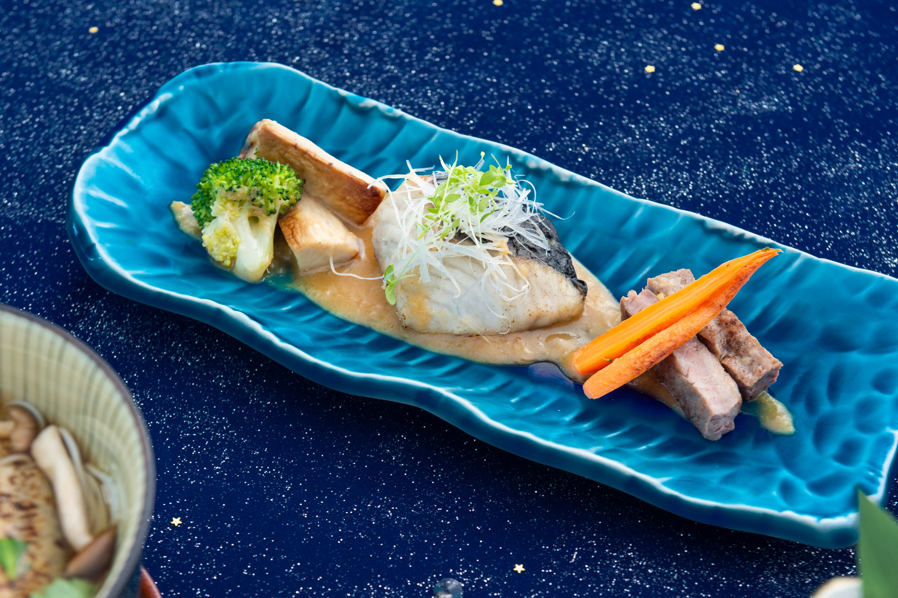 โดยอาหารชุดมื้อกลางวัน ประกอบไปด้วย อาหารเรียกน้ำย่อย ได้แก่ เป็ดรมควัน หอยแมลงภู่ และข้าวโพดอ่อนราดซอสน้ำส้มสายชูไข่แดงและตกแต่งด้วยพริกหยวกรูปดาว ที่เสิร์ฟมาพร้อมกับซุปกุ้งใส่เห็ดฮิเมจิ วุ้นเส้นญี่ปุ่นและผักนานาชนิด และปลาดิบชั้นดี 3 ชนิด (ปลาทูน่า, ปลาหางเหลือง, หอยปีกนก) จากนั้นเชฟจะเสิร์ฟปลาฮิราสึย่างซอสข้าวโพดมายองเนส มะเขือม่วงตุ๋นกับปลาไหล เผือก แครอท ราดซอสงา เทมปุระรวม ข้าวหน้าปลาดาบและไข่ปลาแซลมอน ซุปมิโสะ และผักดอง พร้อมปิดท้ายมื้ออาหารแสนประทับใจนี้ด้วยผลไม้ตามฤดูกาลกับพุดดิ้งมะม่วงราดถั่วแดงเชื่อมและซอสชาเขียว (สำหรับเซ็ตอาหารมื้อกลางวัน ราคาชุดละ 1,600++ บาท)