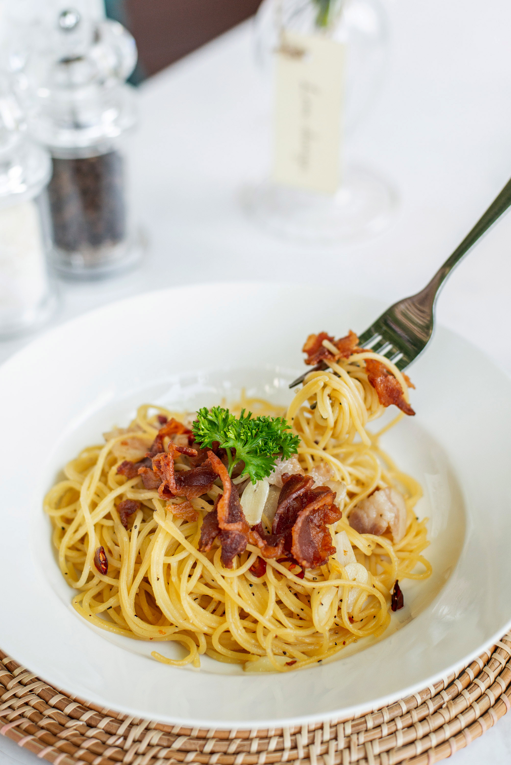 จากนั้นไปต่อกันที่ Ceasar Salad จานที่เหมาะสำหรับคนรักสุขภาพ เป็นเมนูสลัดผักสดที่เสิร์ฟมาพร้อมกับไข่ดาวน้ำ แล้วโรยหน้าด้วยเบคอนกรอบที่มาช่วยเติมรสชาติ ก่อนจะเสิร์ฟเมนูที่หนักท้องขึ้นด้วย Aglio Olio Bacon Spaghetti สปาเก็ตตี้เส้นเหนียวนุ่ม คลุกเคล้าเข้ากันกับเบคอนทอดกรอบและพริก