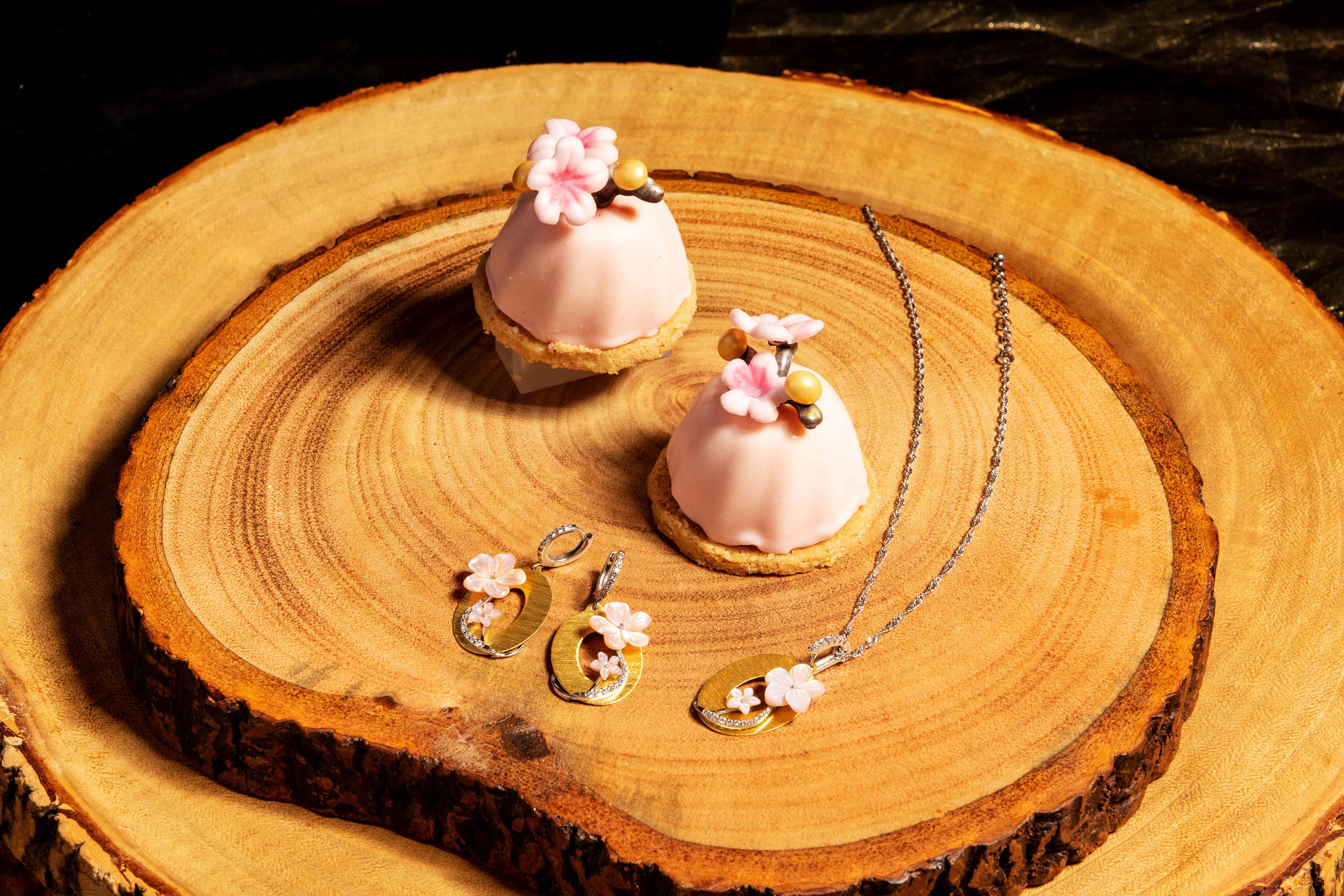 ต่อด้วย มูสพีชและเชอร์รี ที่ตกแต่งด้วยดอกซากุระด้านบน จากคอลเลกชัน Asolo สัญลักษณ์ของความสงบภายใน การบานของดอกไม้ชนิดนี้จึงเป็นสัญลักษณ์ของการเกิด ชีวิต และความงดงาม