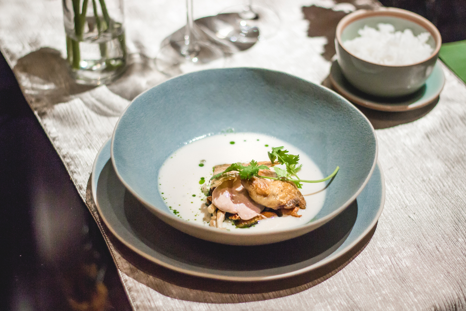 สำหรับเซ็ตเมนูอาหารค่ำจะมีทั้งหมดจำนวน 8 คอร์ส โดยเมนูไฮไลท์ประกอบไปด้วย อาหารเรียกน้ำย่อยอย่าง สลัดแตงกวาปลากะพงแดง ราดด้วยน้ำยำตำมือสดใหม่ที่ปรุงแต่งรสชาติได้ตามใจชอบ (cotton candy salad, red snapper, cucumber) ทูน่าทาร์ทาร์ หรือเมนูปลาทูน่าดิบหมักกับเมล็ดงาในซอสถั่วเหลืองน้ำแข็งไส (Tuna Tartar with sesame and soy) และเนื้อลูกวัวเสิร์ฟพร้อมสัปปะรดดองและซอสเปรี้ยวหวานตะไคร้ ปิดท้ายด้วยเมนูขนมหวานซูเฟล่พิสตาชิโอ (Pistachio Soufflé) ให้รสชาติหอมหวานตบท้ายด้วย petit fours สุดสร้างสรรค์ที่ให้ได้มีส่วนร่วมในการเลือกทานอย่างสนุกสนาน ส่งท้ายอาหารมื้อค่ำนี้ได้อย่างน่าประทับใจ