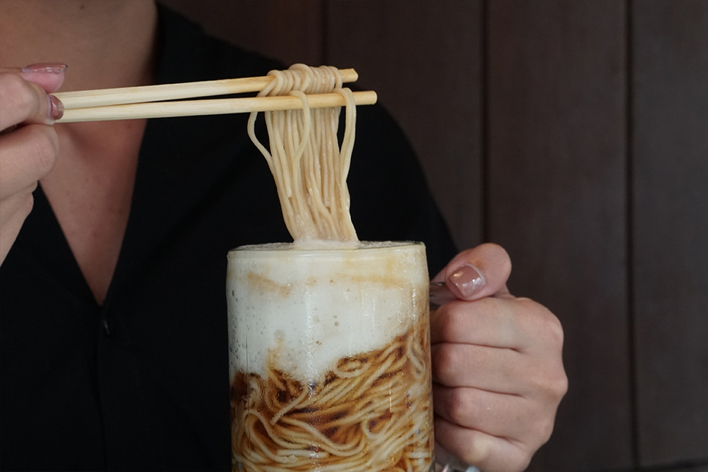 ความพิเศษของราเมนเย็นในแก้วเบียร์นี้ เชฟอุชิดะเริ่มจากการนำเมนูราเมนเย็นที่เป็นเมนูขายดีอีกเมนูหนึ่งของทางร้านมาดัดแปลงเสิร์ฟในแก้วเบียร์เย็นฉ่ำ ท็อปด้วยฟองสีขาวที่ทำมาจากมันญี่ปุ่นนากาอิโมะ ลักษณะคล้ายฟองเบียร์ที่รสชาติเข้ากันดีกับเส้นราเมนเหนียวนุ่ม และซอสซึยุเย็น ให้ความรู้สึกราวกับว่ากำลังดื่มเบียร์อยู่จริง ๆ โดยเสิร์ฟคู่กับท็อปปิ้งเนื้ออกไก่นุ่ม เพิ่มรสชาติด้วยวาซาบิและต้นหอม นอกจากนี้ยังมีท็อปปิ้งเทมปุระแบบพิเศษ ไม่ว่าจะเป็นกุ้งเทมปุระ (Ebi Tempura) ไก่เทมปุระ (Tori Tempura) หรือไข่เทมปุระ (Tamago Tempura) ที่ทานคู่กับราเมนเย็นแล้วเข้ากันสุด ๆ และที่สำคัญจะซดหรือจะดื่มก็อร่อยได้อารมณ์เหมือนเบียร์ แต่รับรองว่าไม่เมาแน่นอน