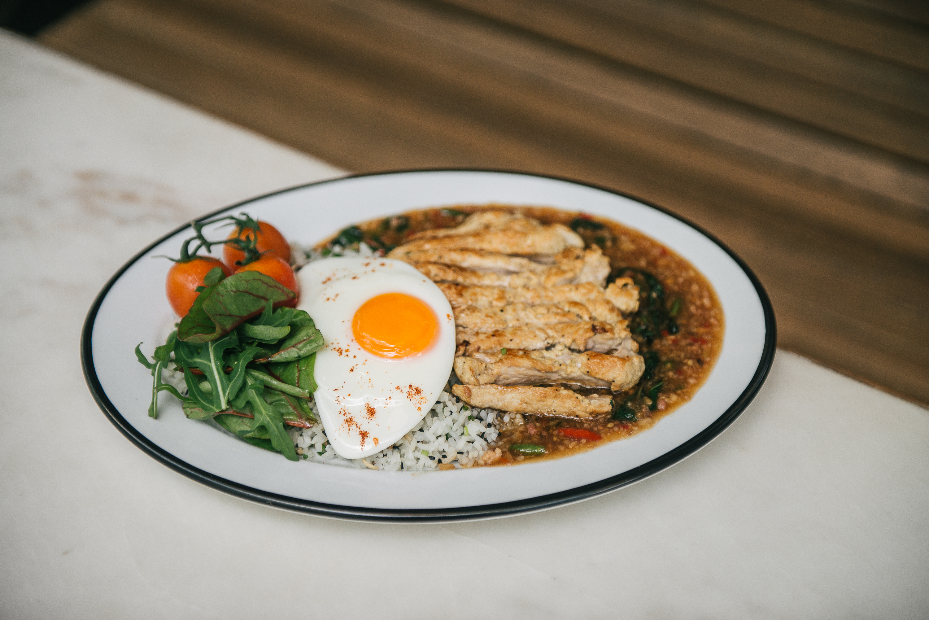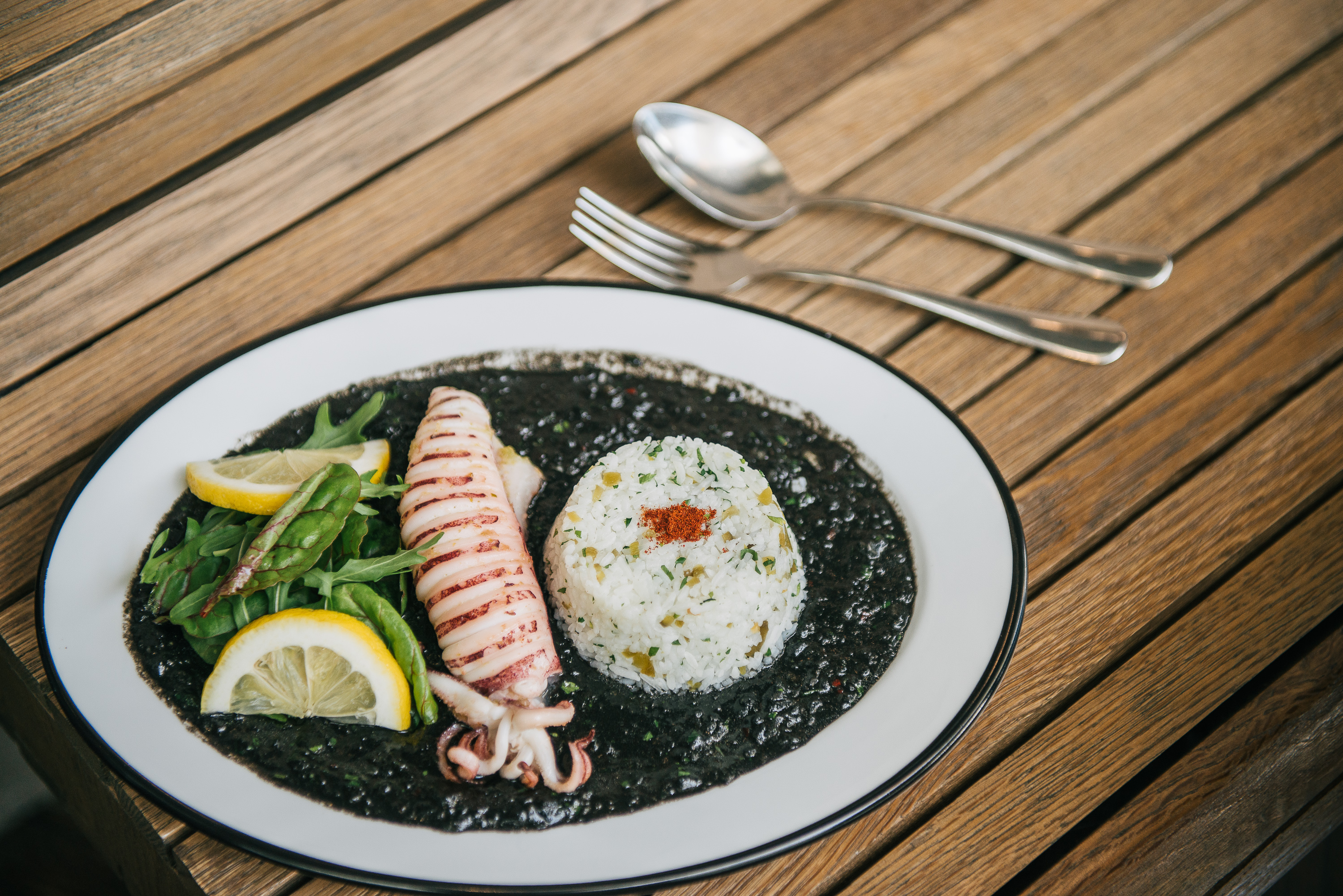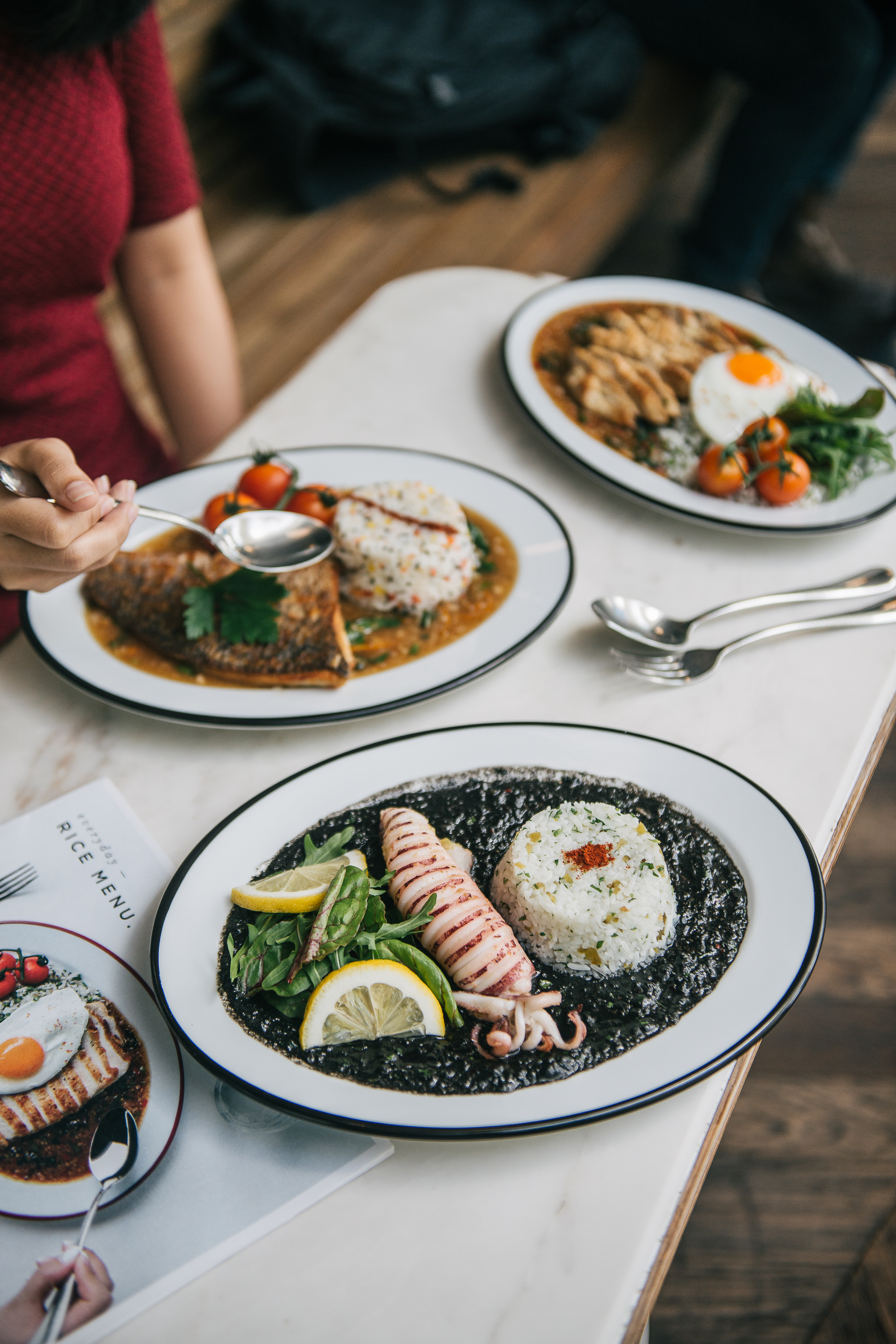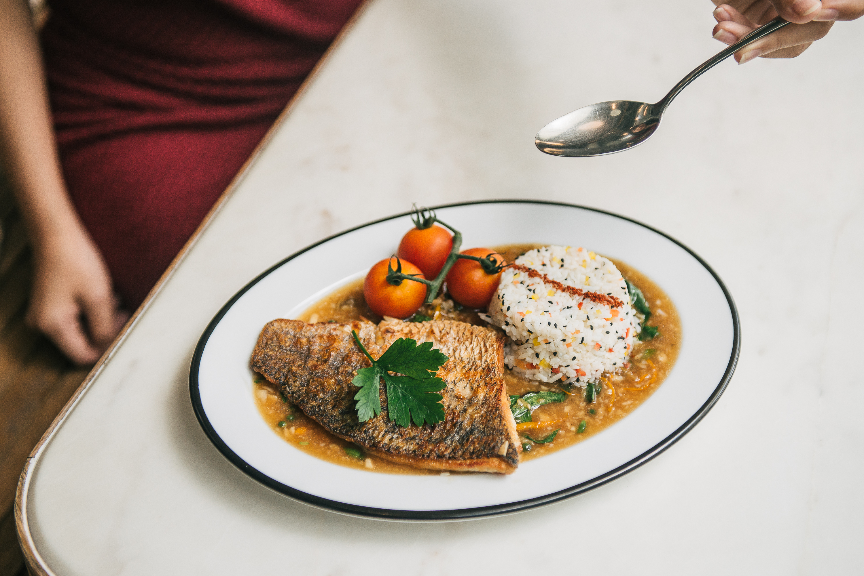 ต่อมาที่เมนูประจำวันเสาร์อย่าง Jasmine Rice with Grilled Squid in Chilli Lime Black Sauce (380 บาท) หรือข้าวปลาหมึกย่างซอสหมึกดำซีฟู้ด จานนี้โดดเด่นด้วยซอสหมึกดำที่ชูเอกลักษณ์ของจาน ได้กลิ่นอายความเป็นซีฟู้ดแน่น ๆ เข้ากันดีกับปลาหมึกตัวโตในจาน ตัวซอสรสเปรี้ยวหวานไม่เผ็ด ให้ความสดชื้น เนื้อปลาหมึกไม่เหนียวเคี้ยวง่าย เข้ากันกับซอสดำ ส่วนเมนูประจำวันอาทิตย์คือ Jasmine Rice with Grilled Sea Bass in Yellow Chilli Peppercorn & Herb Gravy (320 บาท) ข้าวปลากะพงย่างในซอสผัดฉ่า ที่ทางร้านใช้ปลากะพงชิ้นโตเนื้อแน่นทอดจนกรอบ เสิร์ฟมาพร้อมกับซอสผัดฉ่ารสเผ็ดร้อน ในจานมีมะเขือเทศสดลูกโตเพิ่มสีสันให้จาน อร่อยเต็มคำ
