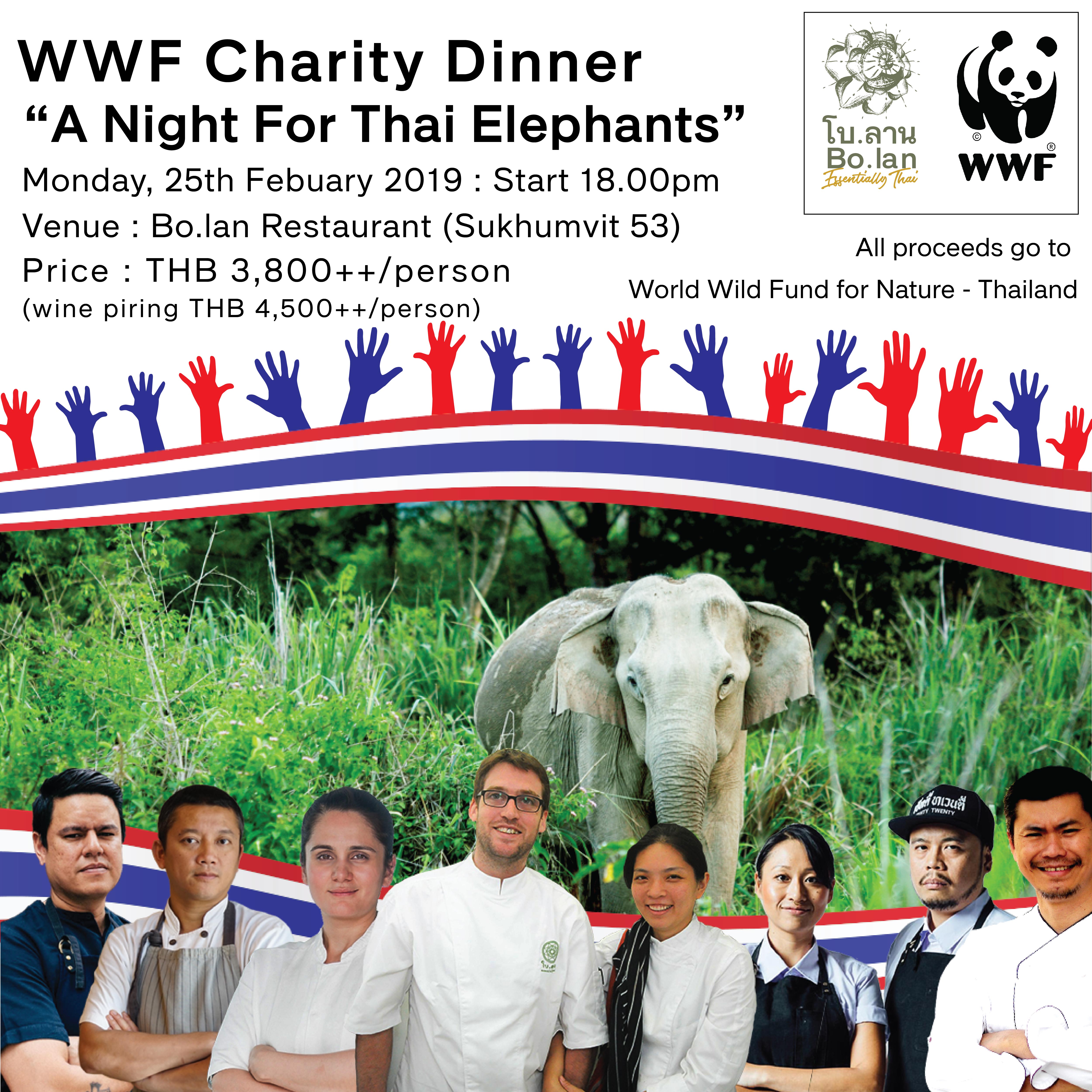 Bo.lan ร่วมกับ World Wild Fund For Nature - Thailand (WWF) เชิญชวนทุกคนมาร่วมเป็นหนึ่งใน 50 คนที่จะร่วมผจญภัยไปกับมื้อค่ำการกุศล คนช่วยช้าง กับเมนูสุดสร้างสรรค์จากป่าใหญ่ในประเทศไทย พร้อมการบรรยายปัญหาเเละเเนวทางเเก้ไขจากนักอนุรักษ์