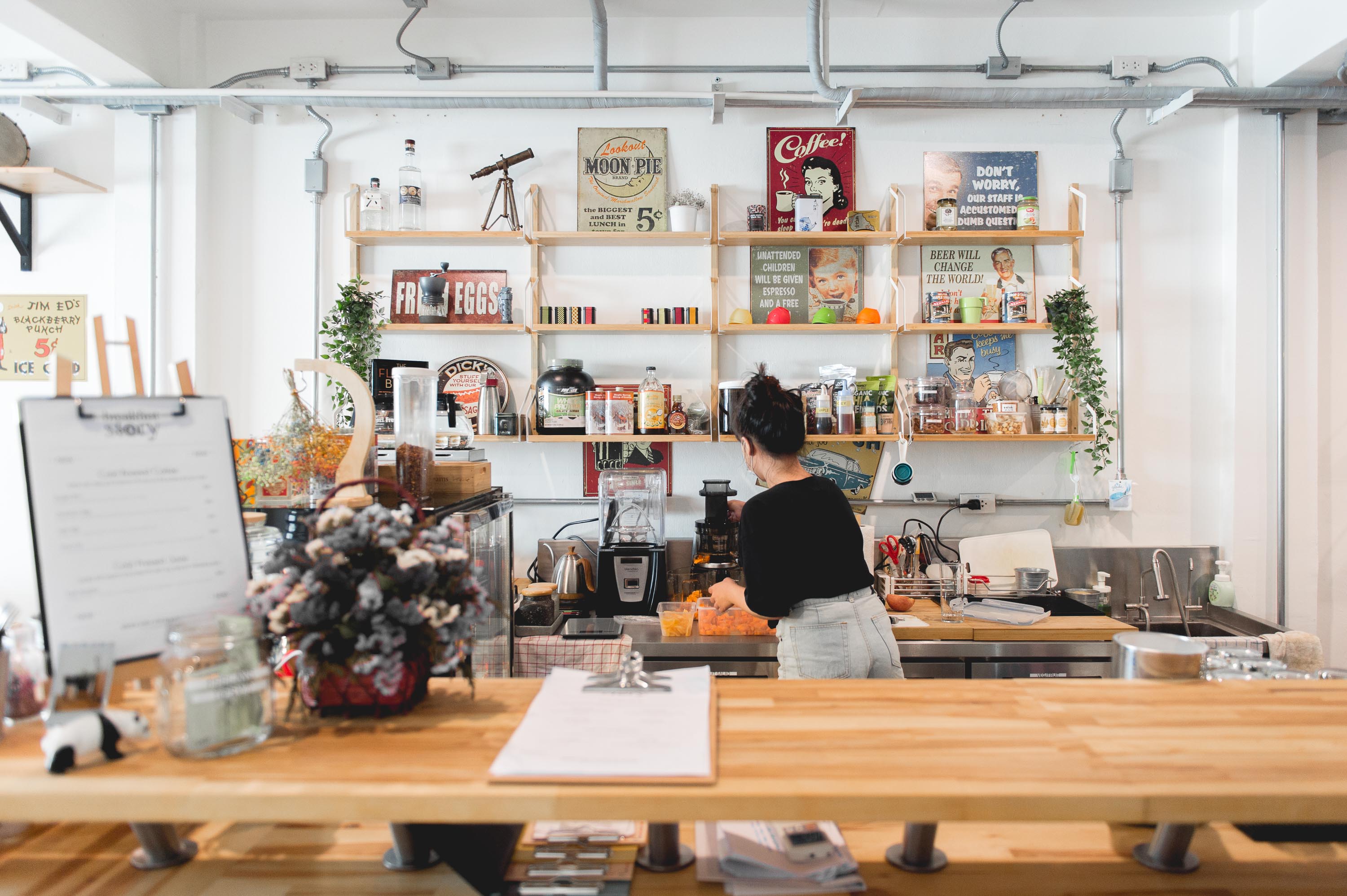 มุมไฮไลท์ภายในร้านที่มองเห็นการทำงานของ Coffee Bar อย่างชัดเจน ร่วมพูดคุยกับบาริสต้าภายใต้บรรยากาศแสนอบอุ่นและเป็นกันเอง