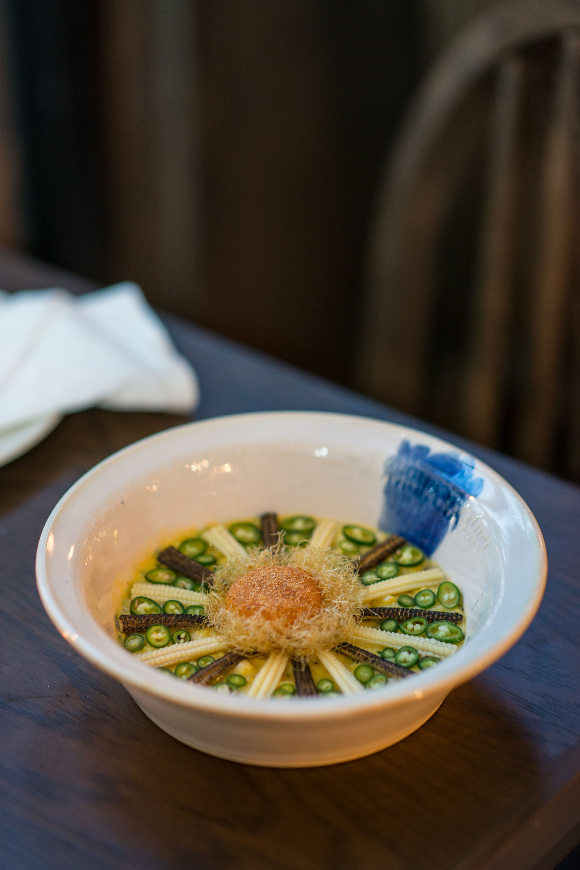 เริ่มต้นมื้อนี้ด้วย Charred sweet corn, crushed & thickened with its milk (420 บาท) เมนูที่ใช้ข้าวโพดเป็นวัตถุดิบหลัก ด้านล่างเป็นพุดดิ้งข้าวโพดหวานผสมเนื้อข้าวโพด เพิ่มความเข้มข้นด้วยชีสส่วนด้านบนเป้ฯข้าวโพดอ่อนที่นำไปย่างตกแต่งด้วยพริกเขียวและท็อปด้วยไข่แดงเคลือบน้ำปลาและน้ำมะนาว