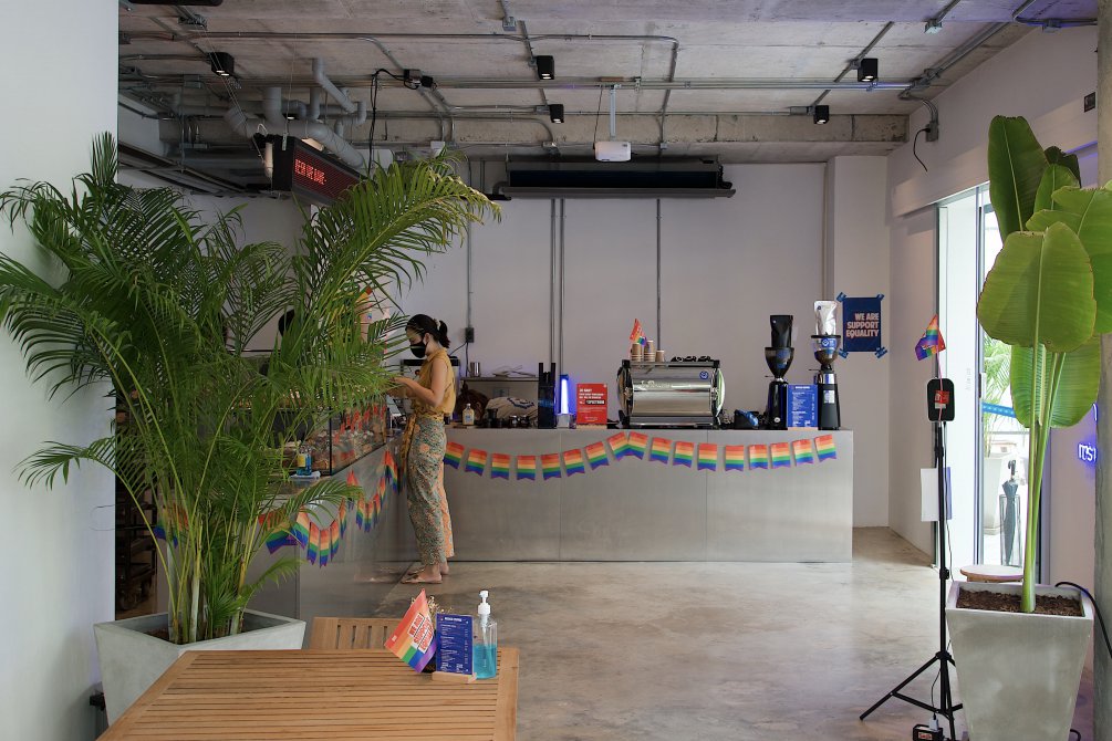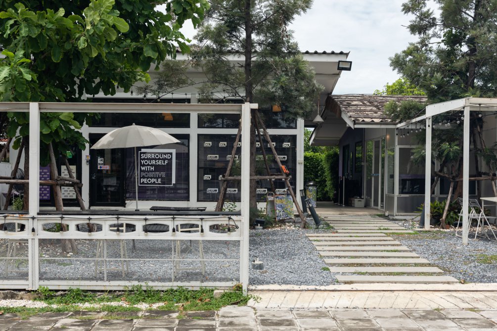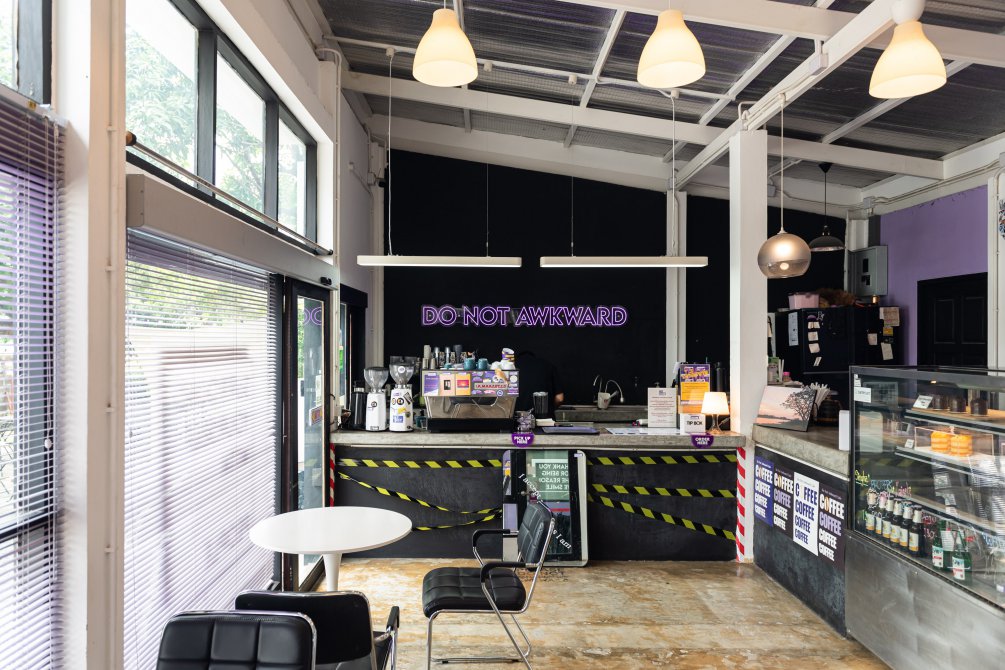 คาเฟ่ดีไซน์เท่ริมทะเลสาบเมืองทองธานีที่เนรมิตบ้านหลังน้อยริมทะเลสาบให้กลายเป็นพื้นที่สนุก ๆ ที่โดดเด่นด้วยการเลือกใช้ “สีม่วง” เป็นสีหลัก ตัดกับลาย Graffiti บนกำแพงที่ให้ความรู้สึกสนุกและเป็นเอกลักษณ์