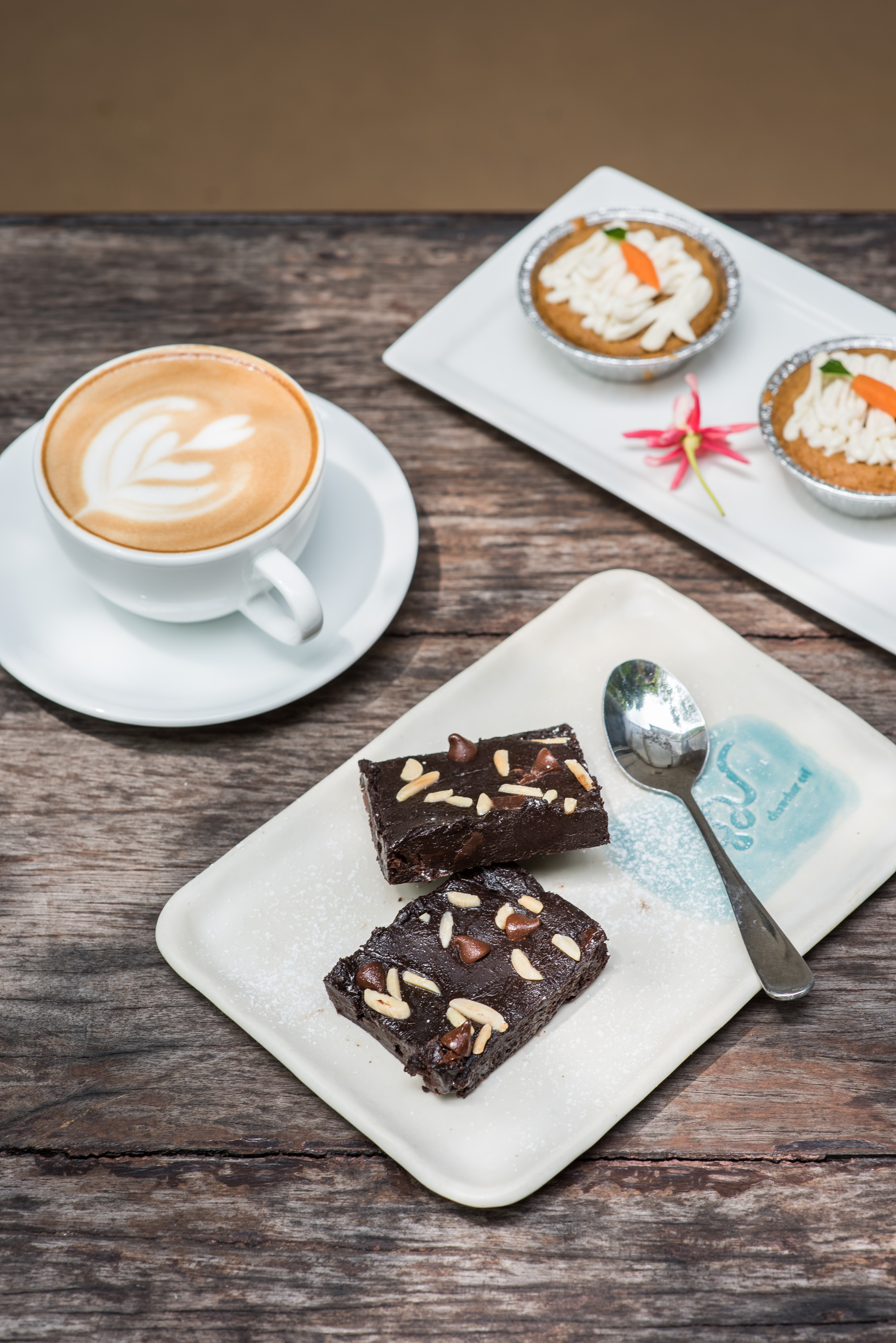 ต่อมาเป็นเมนู Tasuko Brownie ที่มาพร้อมรสชาติเข้มข้นจากช็อกโกแลตแท้ ผสานเข้ากับฟลาวมันสำปะหลัง Tasuko ทำให้ได้เนื้อเค้กที่เบาแต่ให้สัมผัสหนึบ ๆ เคี้ยวเพลิน เช่นเดียวกับเมนู Tasuko Carrot Cake ที่ทางร้านตั้งใจนำเสนอเค้กแครอทชิ้นเล็กน่ารักจากส่วนผสมของฟลาวมันสำปะหลังออร์แกนิก แต่งหน้าด้วยครีมให้เป็นรูปแครอทเล็กน้อย ออกมาเป็นเมนูสุดคิวต์