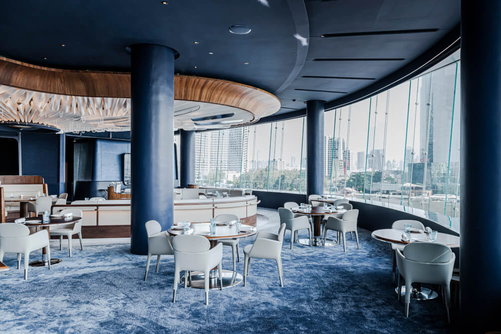 ปิดท้ายที่ตำนานแห่ง icon siam อย่าง Blue by Alain Ducasse ร้านอาหารไฟน์ไดน์นิ่งสัญชาติฝรั่งเศสสุดหรูจากเชฟชาวฝรั่งเศสชื่อดังระดับโลก Alain Ducasse เชฟเจ้าของร้านอาหารระดับมิชลินสตาร์คนแรกที่สามารถคว้า 3 ดาว ได้ถึง 3 ร้าน ในช่วงเวลาเดียวกัน ในส่วนของบรรยากาศก็พิเศษไม่แพ้กัน เพราะโซน Dining ที่นี่ถูกล้อมรอบด้วยกระจกใสเปิดให้เห็นวิวแม่น้ำเจ้าพระยาแบบพาโนรามา ตัดกับพื้นและผนังสี Royal Blue ที่ดูสง่างาม