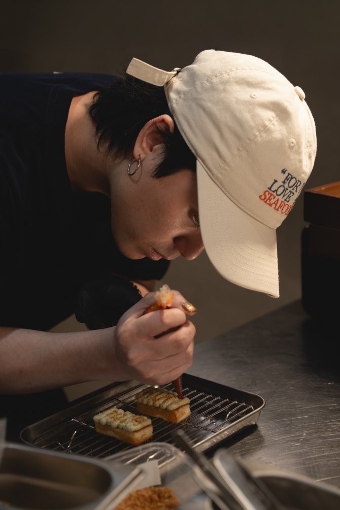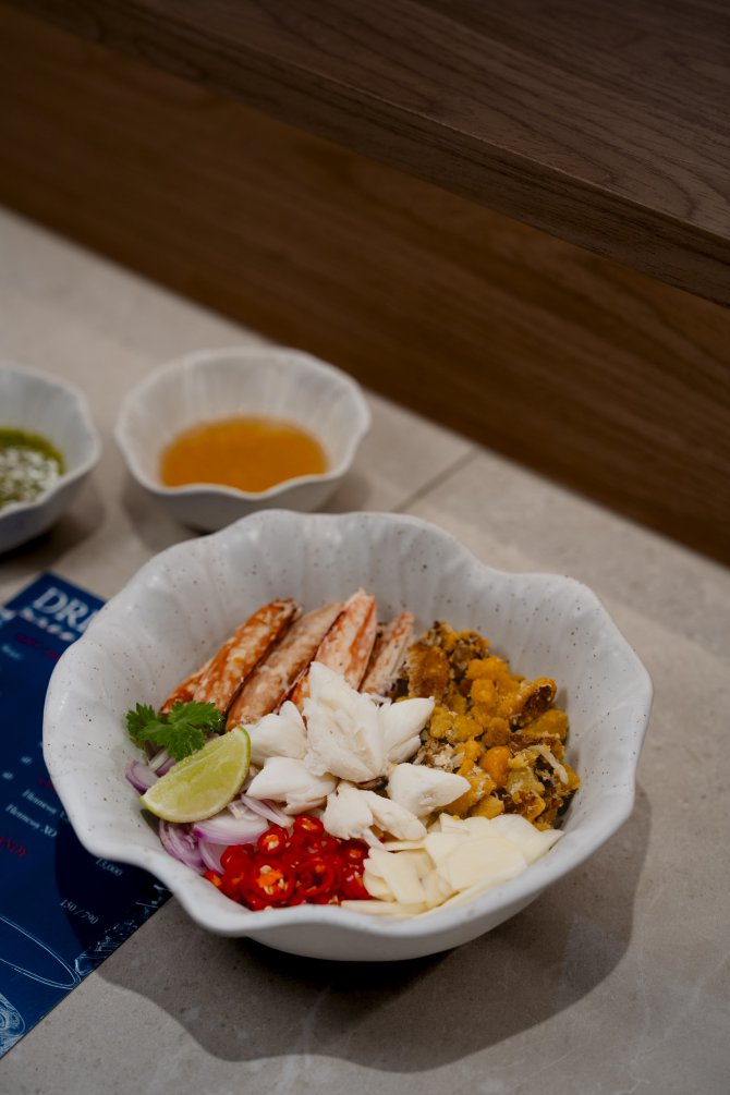 “ถ้าชอบสุดเลยก็คือโครเกต์กรรเชียงปูใบชะพลูนี่แหละครับ กับอีกอันคือ Bite Oyster Mousse เป็นตัวแรกที่ผมเริ่มทำ Chef’s Table มันจะเหมือนเรากินหอยนางรมน้ำพริกเผาในคำเดียวแบบนั้น กับอีกอันที่ไม่พูดถึงไม่ได้เลยคือข้าวขยำปู คือผมรู้สึกว่ามันคือ Simply Lovely คือมันดูเหมือนไม่มีอะไรเลย มีปู เครื่องเคียง น้ำยำ แต่เรามั่นใจมากว่าปูเรามาจากที่ดี ทั้งกรรเชียงทั้งไข่ปู และให้ปริมาณที่คุ้มค่า กินกับน้ำจิ้มซีฟู้ดแล้วพอดี แล้วมันยังเป็น Hero Product ของร้าน ที่ทำให้ทะเลใจมีสาขาสอง สามเรื่อย ๆ ไม่มีอะไรสู้ข้าวขยำปูได้จริง ๆ”