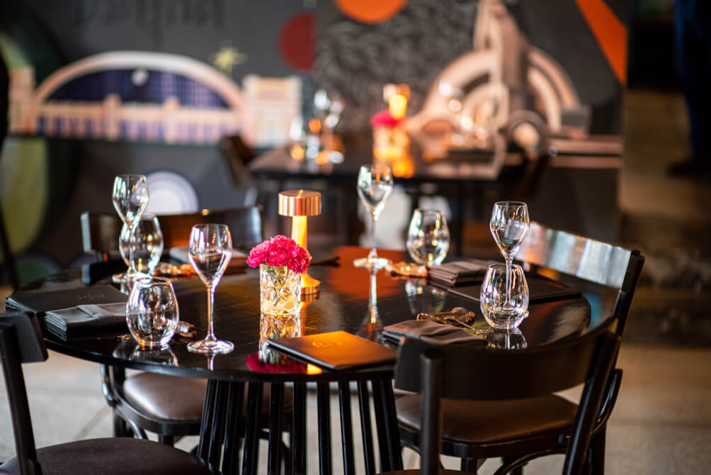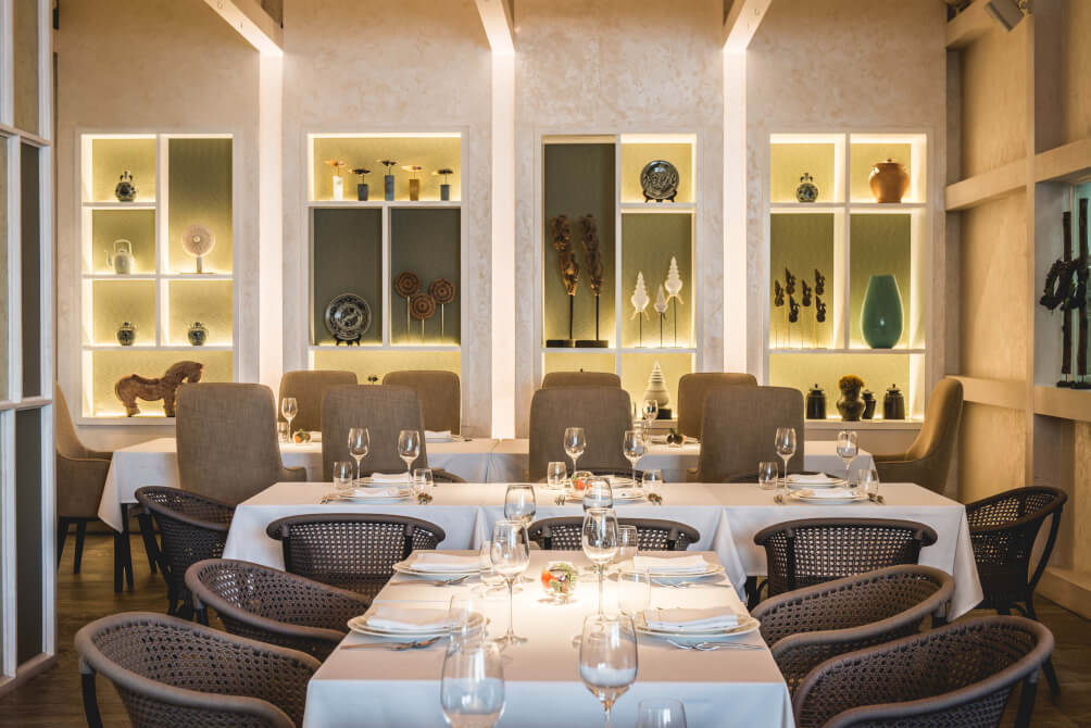 บรรยากาศภายในร้านอบอวลด้วยกลิ่นอายหรูหราร่วมสมัย ผสานเส้นสายของศิลปะไทยเข้ากับดีไซน์มินิมัล ให้ความรู้สึกสงบและอบอุ่น เหมาะกับการดื่มด่ำมื้อพิเศษในบรรยากาศดีๆ ​