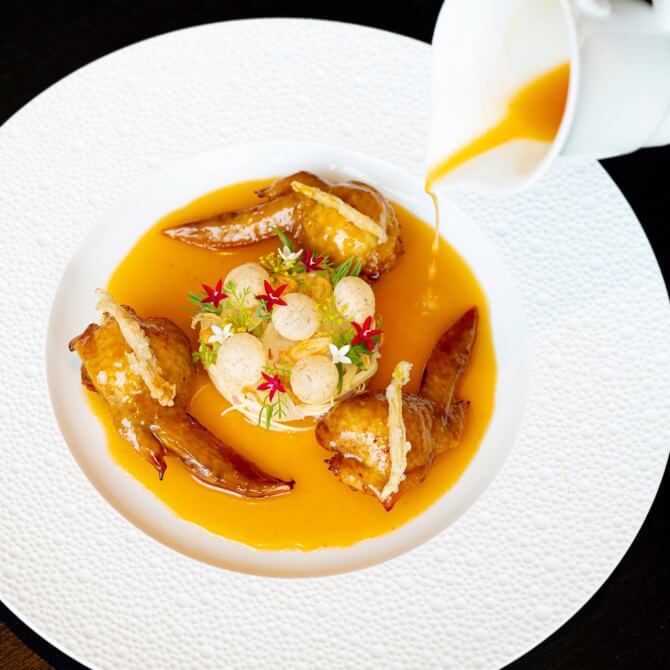 เมนูที่นี่เน้นความสดใหม่ของวัตถุดิบที่ผ่านการรังสรรค์ของเชฟคนดัง สู่เมนูที่ประณีตราวกับงานศิลปะ เช่น Lobster with Caviar หรือ Duck with Orange Jus ที่ทั้งจัดจานมาอย่างสวยงามและน่าจดจำ​