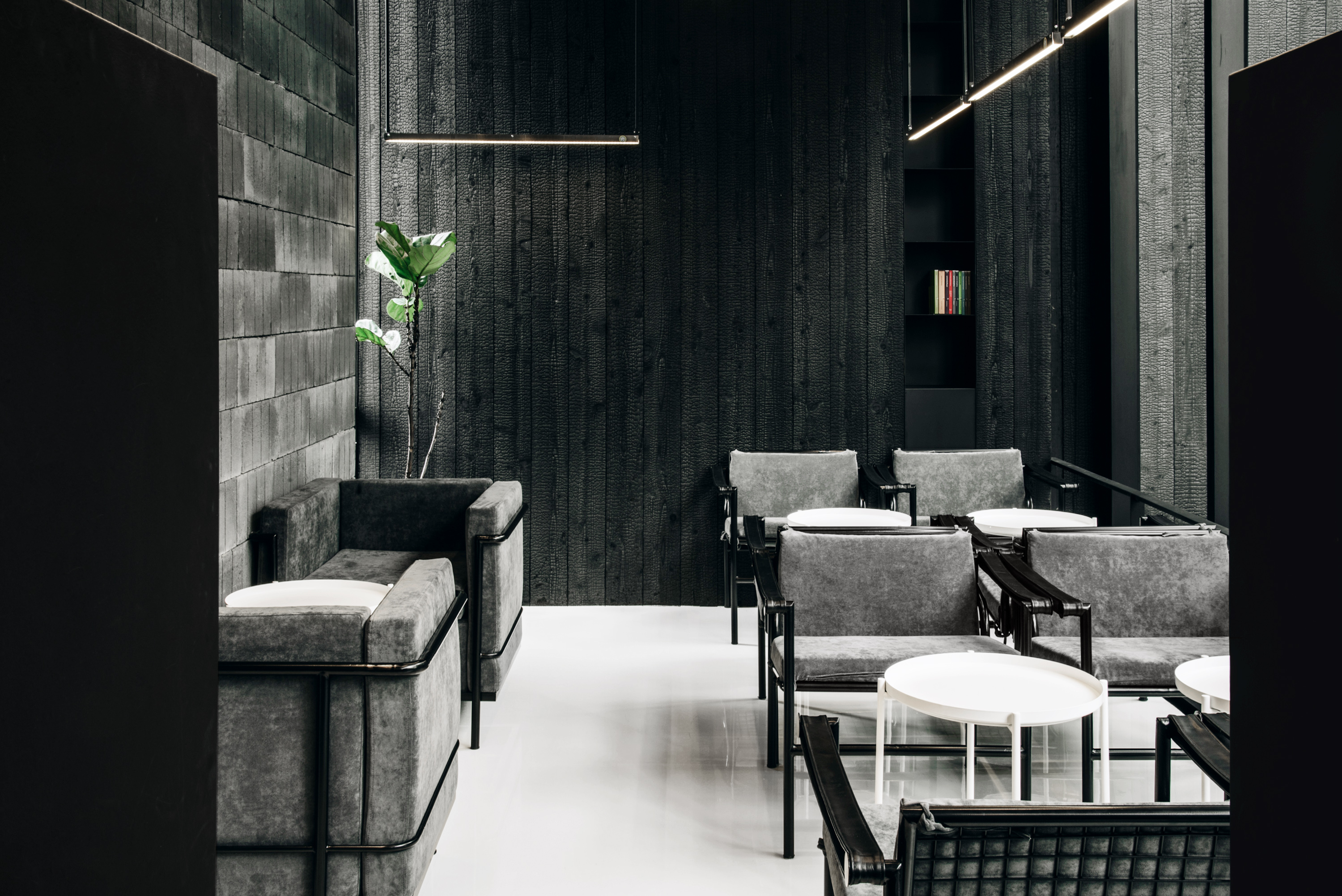 คาเฟ่แห่งนี้โดดเด่นด้วยการออกแบบสถาปัตยกรรม ตัวอาคารสีดำจาก facade ไม้ Yakisugi พร้อมด้วยโครงสร้างวัสดุสไตล์ Industrial Loft ด้านนอกปูพื้นด้วยงานไม้และหิน วางแนวรั้วด้วยต้นไม้สีเขียวที่ให้ความร่มรื่นสบายตา ส่วนภายในอาคารเผยให้เห็นโครงสร้างเหล็กที่พาดผ่านและเชื่อมโยงกัน สอดแทรกด้วยรายละเอียดมากมายไว้ตามมุมต่าง ๆ