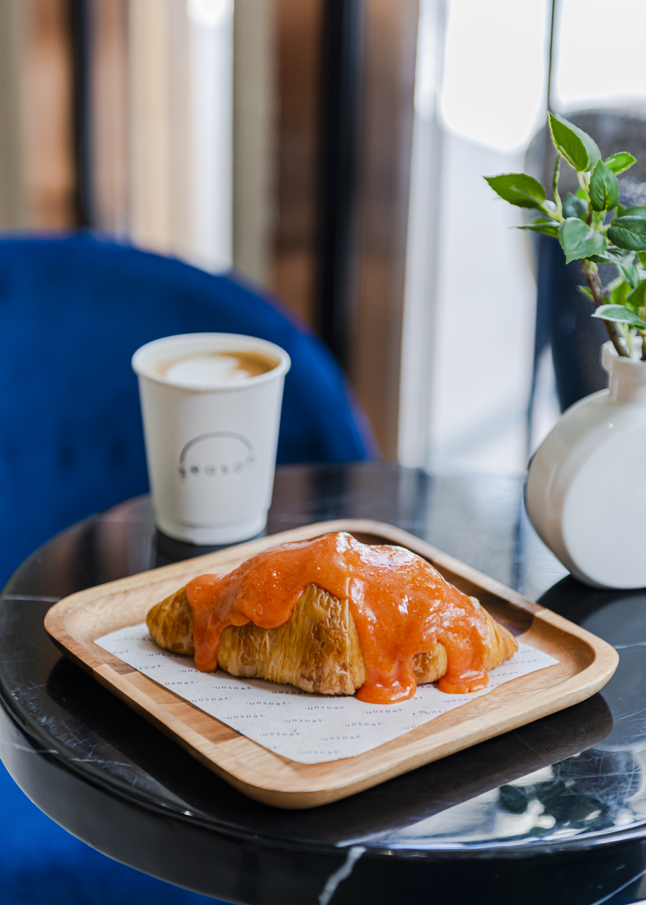 หรือจะลองเป็น Salted Eggs Croissant (135 บาท) ครัวซองต์โฮมเมดที่สอดไส้ซอสไข่เค็มแบบเน้น ๆ ได้รสชาติเข้มข้นกลมกล่อม สามารถจับคู่ทานกับ Hot Latte (95 บาท) ลาเต้ร้อนที่ใช้เมล็ดกาแฟเบลนด์จากดอยช้าง โดยสามารถเลือกดื่มได้ระหว่างเมล็ดคั่วเข้มหรือคั่วกลาง ซึ่งทางร้านจะเบลนด์ให้ได้รสชาติกลาง ๆ ดื่มง่าย ไม่เข้มขมจนเกินไป