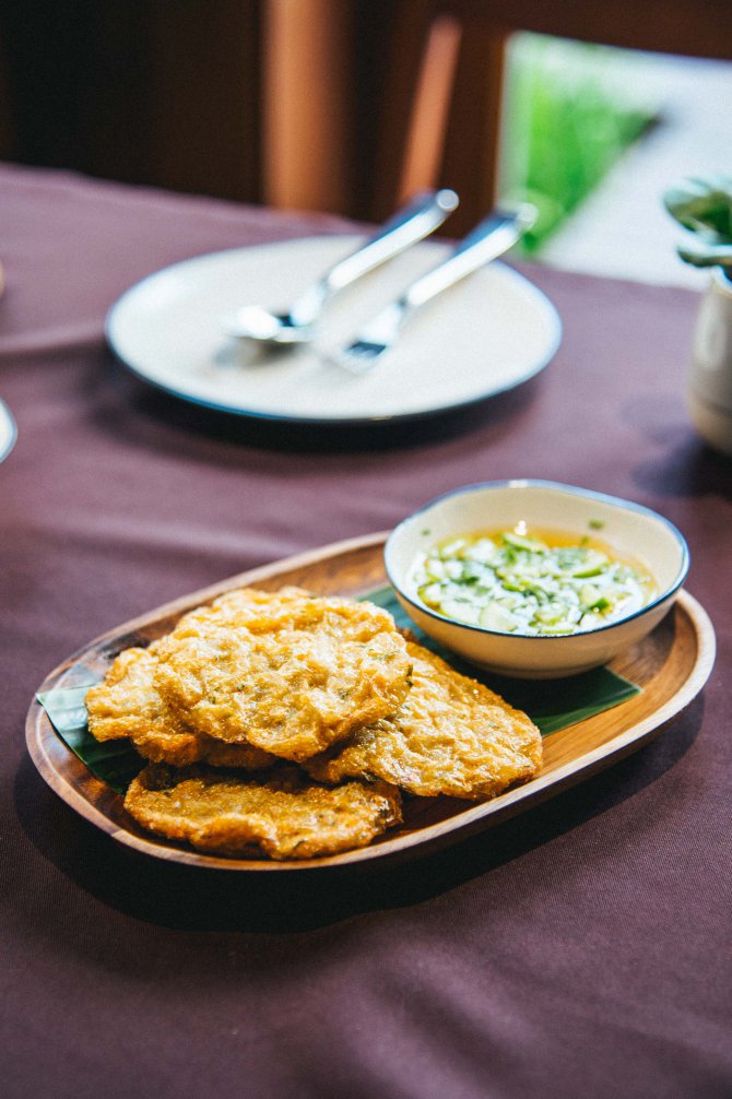 เมนูที่ต้องลองชิมยกให้ ปลาแห้งแตงโม (125 บาท) อาหารว่างคลายร้อนแบบไทย ๆ ที่ทางร้านเลือกใช้เนื้อปลาช่อนแห้งแล้วนำมาผัดกับเกลือและน้ำตาล เสิร์ฟมาพร้อมกับเนื้อแตงโมที่คว้านมาเป็นก้อนกลม ๆ เป็นการผสมผสานรสชาติของอาหารคาวและผลไม้ที่เข้ากันได้เป็นอย่างดี ต่อด้วยเมนูที่เอาใจคนชอบทานปลาอย่าง ทอดมันปลาฉลาด (195 บาท) เป็นทอดมันปลาน้ำจืดชนิดหนึ่งที่มีเนื้อเหนียวหนึบกว่าปลากราย ทางร้านตำเครื่องแกงสดแบบไม่ใช้พริกแกงแดงปนอยู่ในเนื้อปลา เมื่อนำไปทอดจะให้สีสันที่น่าทาน เสิร์ฟคู่กับน้ำอาจาด ได้รสชาติกลมกล่อม