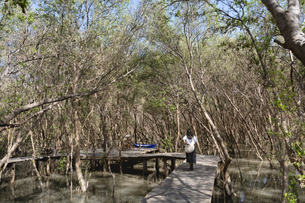 เดินต่อมาอีกนิด จะพบกับทางเดินทอดยาวไปสู่ส่วนของป่าชายเลน ที่ด้านในมี Hidden Gems ลับๆ ที่เราขอแนะนำเป็นร้านอาหารพื้นบ้านอย่าง สะแม๋ ร้านอาหารไทยและซีฟู้ดเรียบง่ายที่ซ่อนตัวอยู่ในป่าโกงกาง เสิร์ฟความอร่อยแบบบ้าน ๆ อาหารราคาดี เป็นกันเอง และมีลมทะเลพัดเย็นสบายทั่วทั้งร้าน
