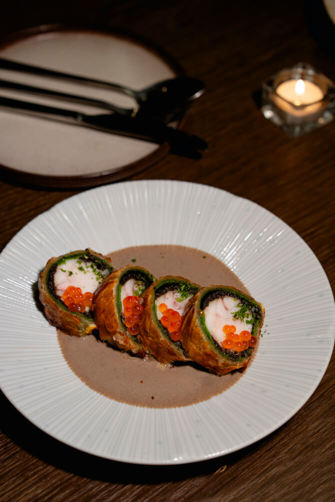 เมนูแนะนำ : ‘Grouper Wellington’ เมนูเวลลิงตันสุดสร้างสรรค์ที่ทางร้านได้เลือกนำเนื้อปลาเก๋ามาเป็นวัตุดิบหลักสำหรับสอดไส้แป้ง ปรับส่วนผสมเล็กน้อยจากผักบดมาเป็นผักเคลและมูสเห็ด เพื่อเสริมความชุ่มฉ่ำให้กับเท็กซ์เจอร์ของเนื้อปลาเก๋ามากขึ้น พร้อมซอสที่ทำจาก ‘ดาชิ’ ให้ได้สัมผัสถึงกลิ่นอายความเป็นอาหารญี่ปุ่น