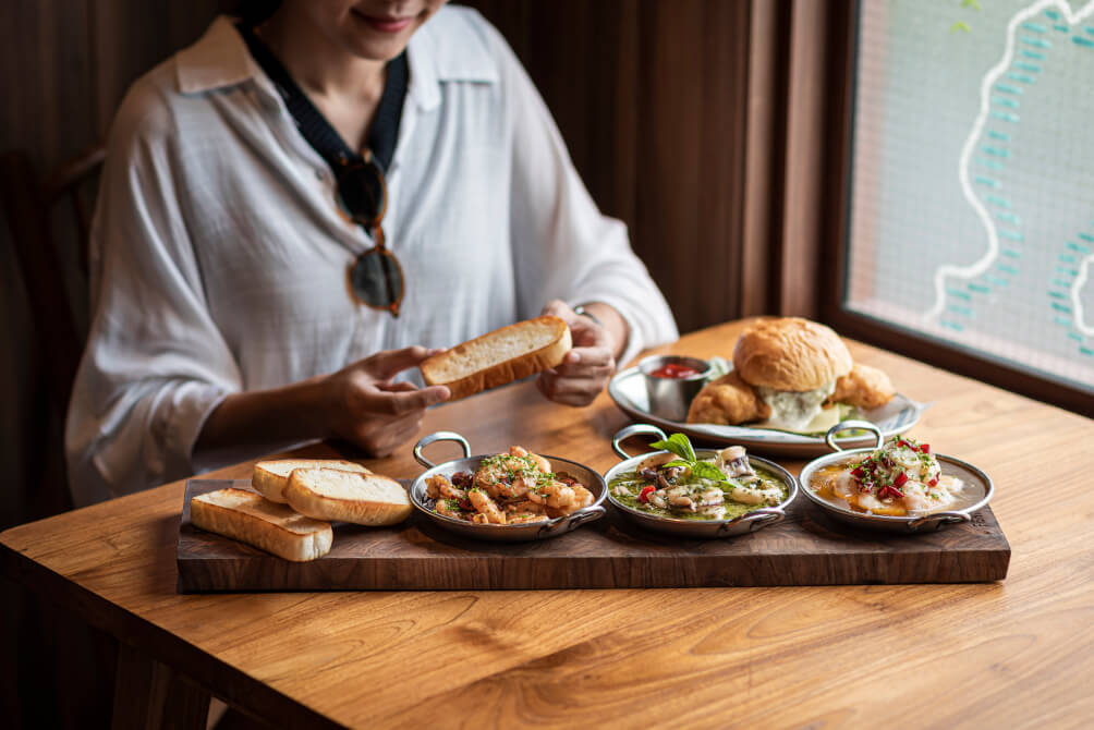 เมนูแนะนำ : ‘Fishmonger Platter’ ฟิชมองเกอร์รวมมิตรที่เสิร์ฟมา 3 อย่างด้วยกัน จานแรกเป็น Chorizo Prawn กุ้งแชบ๊วยหรือกุ้งทะเลที่ให้สัมผัสกรอบและรสชาติหวาน ก่อนจะนำมาผัดกับ Chorizo หรือไส้กรอกสเปน ให้รสชาติเข้มข้นด้วยพริกแห้งและกระเทียม ตามด้วยจานที่สอง Pesto Squid ปลาหมึกเพสโต้ ที่ทางร้านเลือกใช้ปลาหมึกหอมที่ไม่ผ่านการแช่น้ำจืดระหว่างส่งจากทะเล ทำให้มีความสดและรสชาติหวาน คลุกเคล้าเข้ากับซอสโหระพารสกลมกล่อม จานสุดท้ายเป็น Garlic Prawn มีส่วนผสมของกุ้ง น้ำมัน กระเทียม และพริกแห้ง ทานคู่กับ Cuban Bread ขนมปังคิวบันโฮมเมดของทางร้าน เข้ากันได้อย่างพอดิบพอดี
