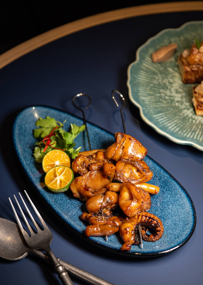 เมนูแนะนำ : ‘Grilled Tentacles’ หนวดปลาหมึกย่างชิ้นโต เนื้อนุ่มหนึบหนับ ชุ่มฉ่ำไปด้วยซอสสูตรเฉพาะรสเข้มข้น เสิร์ฟมาให้รับประทานคู่กับน้ำจิ้มซีฟู้ดรสเด็ด วิธีการรับประทานสามารถทานได้ทั้งแบบไม่ราดน้ำจิ้ม แบบราดส้มจี๊ด และแบบราดน้ำจิ้มซีฟู้ด แต่ไม่ว่าจะเลือกลิ้มลองแบบไหนก็ถูกปากทั้งนั้น