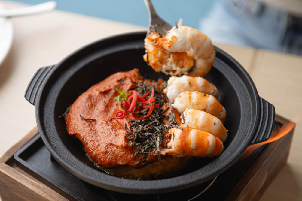 เมนูแนะนำ : ‘ข้าวกุ้งแม่น้ำแกะและมันกุ้งหม้อร้อน’ ข้าวญี่ปุ่นผสานน้ำมันทะเลจี่ลงในหม้อหินร้อนจนกรอบ ท็อปด้วยมันกุ้งแบบจัดเต็มและกุ้งแม่น้ำสดย่างถ่าน เนื้อนุ่มเด้ง ก่อนคลุกเคล้าให้เข้ากัน