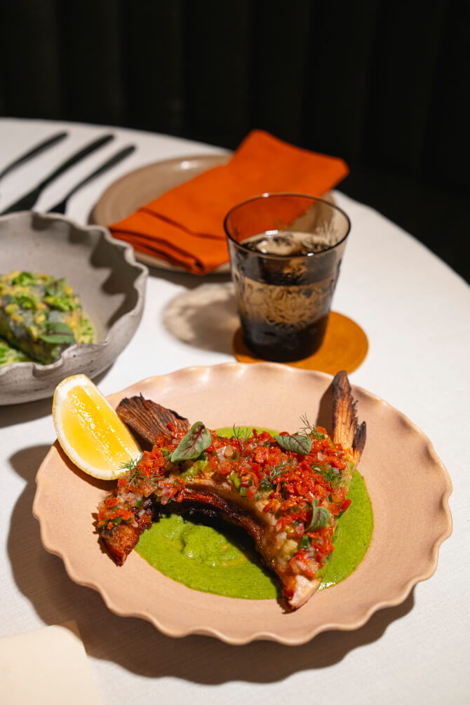 เมนูแนะนำ : ‘Hamachi collar’ เมนูแก้มปลาฮามาจิที่เสิร์ฟมาคู่กับ Tomato & Jalapeno Salsa หรือเครื่องจิ้มซัลซ่าสไตล์เม็กซิกัน ด้านบนโรยด้วยกุ้งแห้งที่ทอดด้วยน้ำมันจากไขมันวัวรสเข้มข้น ส่วนซอสด้านล่างจะเป็น Mojo Verde หรือซอสเขียวที่ทำจากน้ำส้มสายชู กระเทียม ต้นหอม และน้ำมัน ผสมเข้ากับซาวร์ครีม ตามสูตรเครื่องจิ้มของชาวสเปน ให้รสเปรี้ยวอมหวานที่ตัดกับความเค็มของแก้มปลาได้ดี ผสมผสานรสชาติออกมาอย่างลงตัว