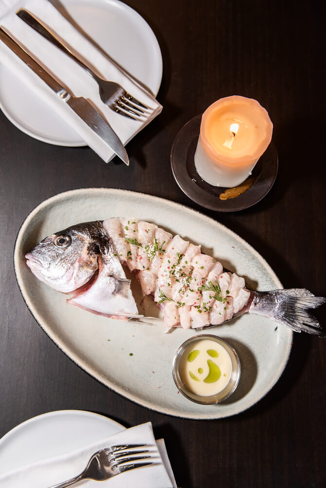 เมนูแนะนำ : ‘Dry aged seabream sashimi - yusu kosho vinaigrette’ เนื้อปลากะพงทะเลสดใหม่ที่ผ่านการดรายเอจควบคุมอุณหภูมิในตู้มาเป็นระยะเวลา 3-4 วัน นำมาสไลด์ทำเป็นซาชิมิแบบชิ้นพอดีคำ ดีไซน์ดิสเพลย์จัดเสิร์ฟมาในลักษณะของตัวปลาแบบเห็นทั้งตัว เนื้อปลามีความสดเด้ง รับประทานคู่กับเดรสซิ่ง yusu kosho ที่ให้กลิ่นอายของความเป็นญี่ปุ่นเล็กน้อย เป็นการผสานความอร่อยในสไตล์ตะวันตกและตะวันออกได้เข้ากันอย่างลงตัว