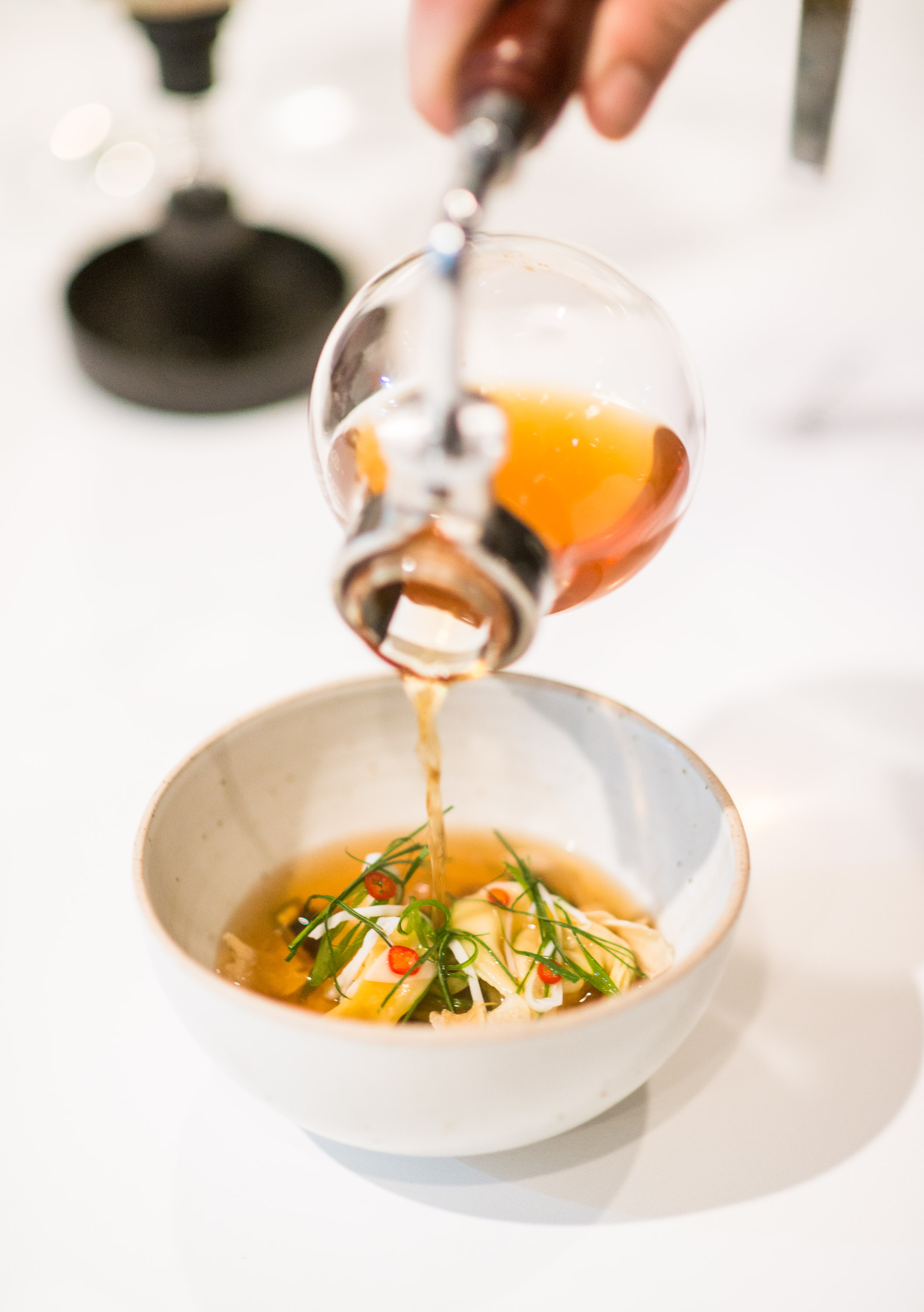 ต่อด้วยเมนู Tortellini เมนูที่เชฟได้แรงบันดาลใจมาจากอาหารไทยอย่าง ต้มข่าไก่ มีการนำเสนอที่น่าตื่นเต้นโดยใช้วิธีต้มน้ำซุปให้เดือดในเครื่องชงกาแฟ ก่อนที่จะเทน้ำซุปลงไปในชามที่มีเกี๊ยวสอดไส้เนื้อหมู เพิ่มรสเปรี้ยวด้วยแตงกวาดอง