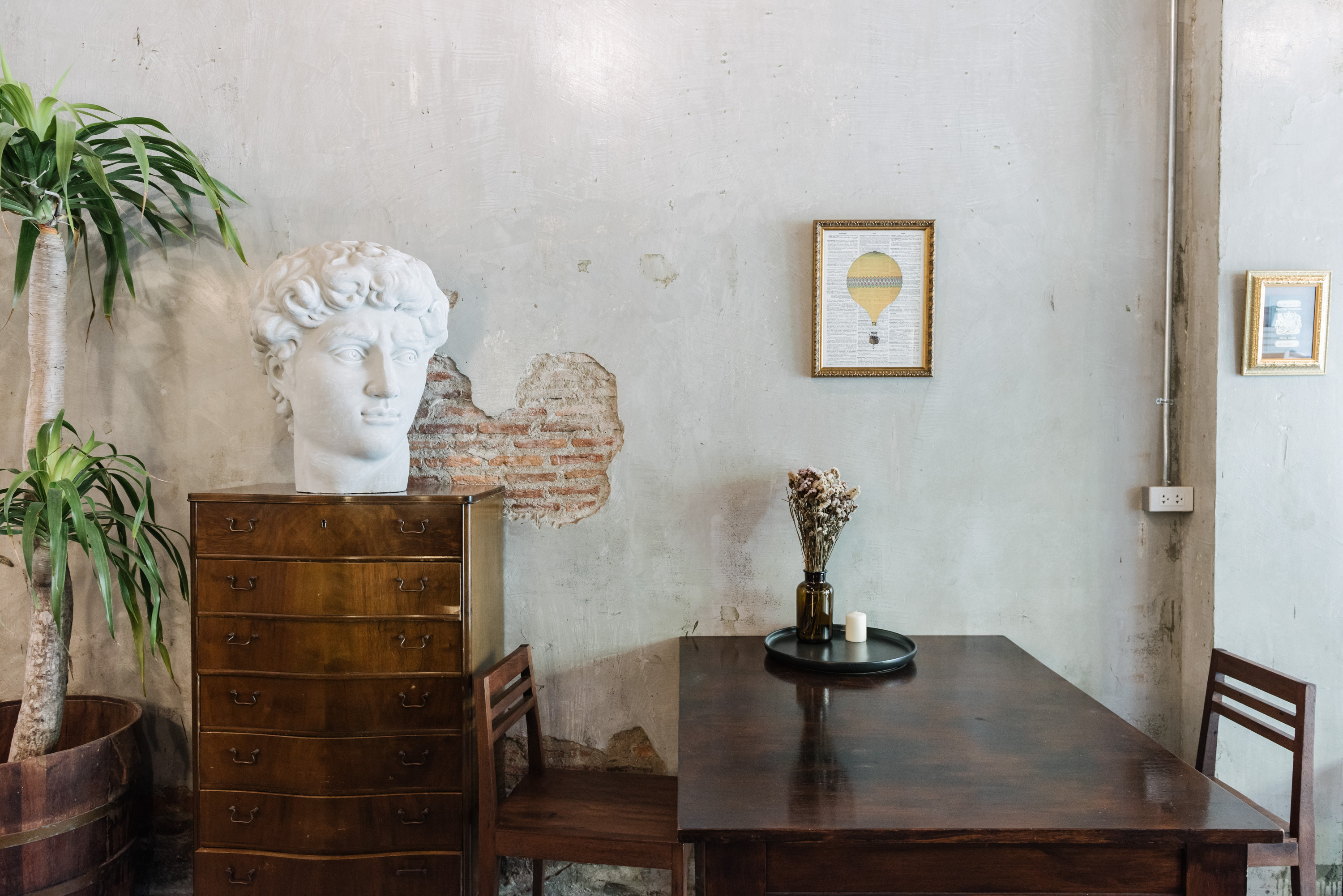 ในส่วนของด้านล่างจะพบกับโซนคาเฟ่ ที่ตกแต่งด้วยเฟอร์นิเจอร์ดีไซน์สวย อันเต็มไปด้วยรายละเอียดของสถาปัตยกรรมโบราณ ซึ่งผสมผสานกลิ่นอายสไตล์วินเทจออกมาได้อย่างลงตัว ไม่ว่าจะเป็นมุมโต๊ะไม้สุดคลาสสิกที่ทางร้านนำมาตกแต่งเพื่อสื่อถึงความคราฟต์ หรือมุมตู้หนังสือที่ประดับตกแต่งด้วยข้าวของเครื่องใช้และกระเป๋าเดินทางสุดวินเทจ ล้วนแฝงความอบอุ่นและเรื่องราวของแต่ละมุมออกมาได้อย่างลงตัว และบริเวณด้านหลังของร้านนั้น ยังถูกจัดเป็นมุมเคาน์เตอร์บาร์กาแฟ ที่คอยส่งกลิ่นหอมอบอวลของกาแฟดริปและเมนูเครื่องดื่มที่ชงโดยบาริสต้ามากฝีมืออีกด้วย