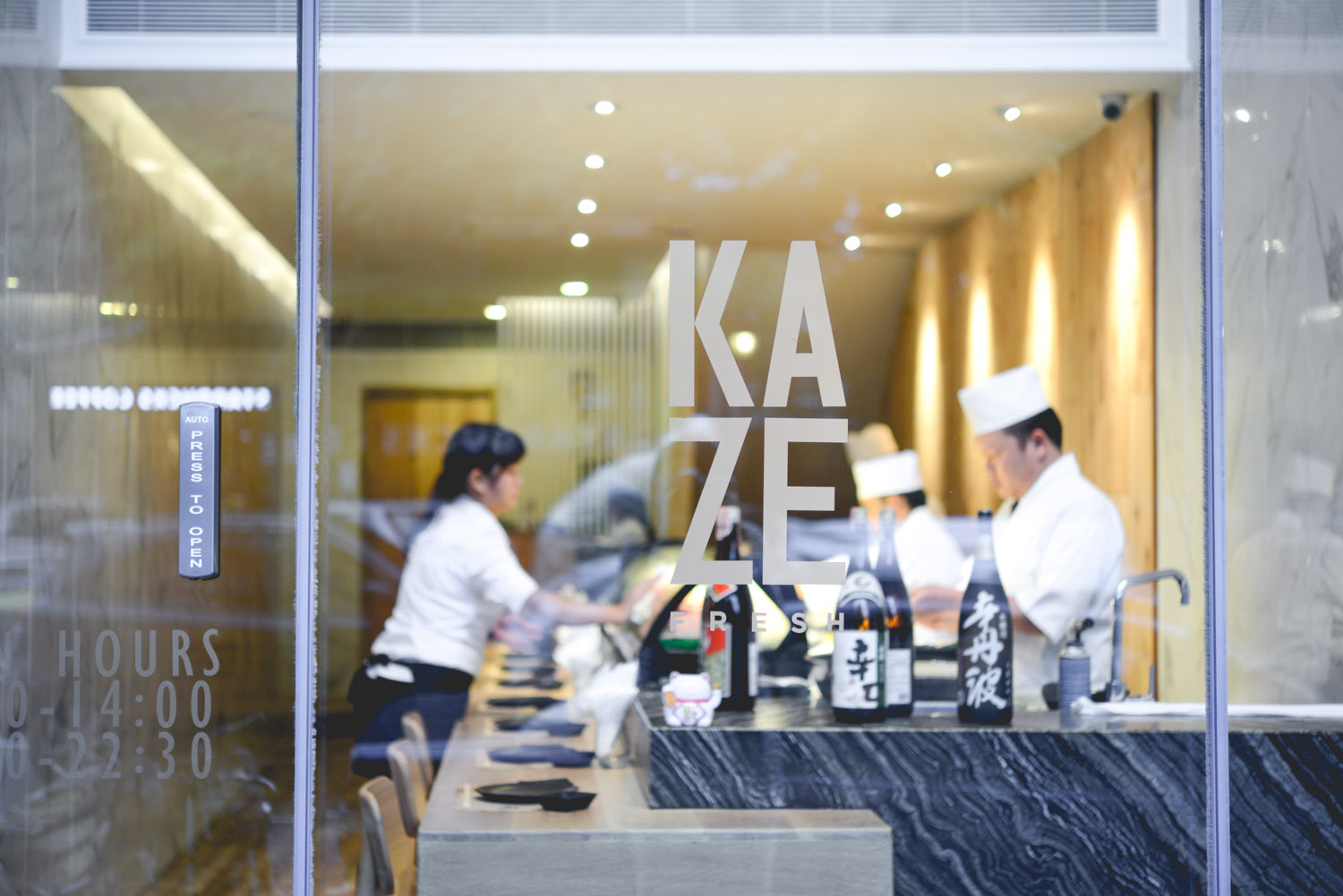 Kaze ร้านอาหารญี่ปุ่นน้องใหม่ใจกลางทองหล่อตั้งอยู่ระหว่างซอย 10 กับ 12 ติดกับร้าน Wine Republic ขนาดไม่ใหญ่มาก มี 2 ชั้น ออกแบบให้โปร่งโล่งด้านหน้าเป็นเหมือนช่องลมตามความหมายของชื่อร้านที่แปลว่า “ลม” โดยชั้นล่างจะโชว์ส่วนเคาน์เตอร์ซูชิบาร์ ก่อนหาที่นั่งเงียบ ๆ ด้านบน ตกแต่งแบบเรียบๆ ไม่หวือหวามาก เพิ่มลูกเล่นนิดหน่อยด้วยลวดลายปลาคาร์ปบนผนัง