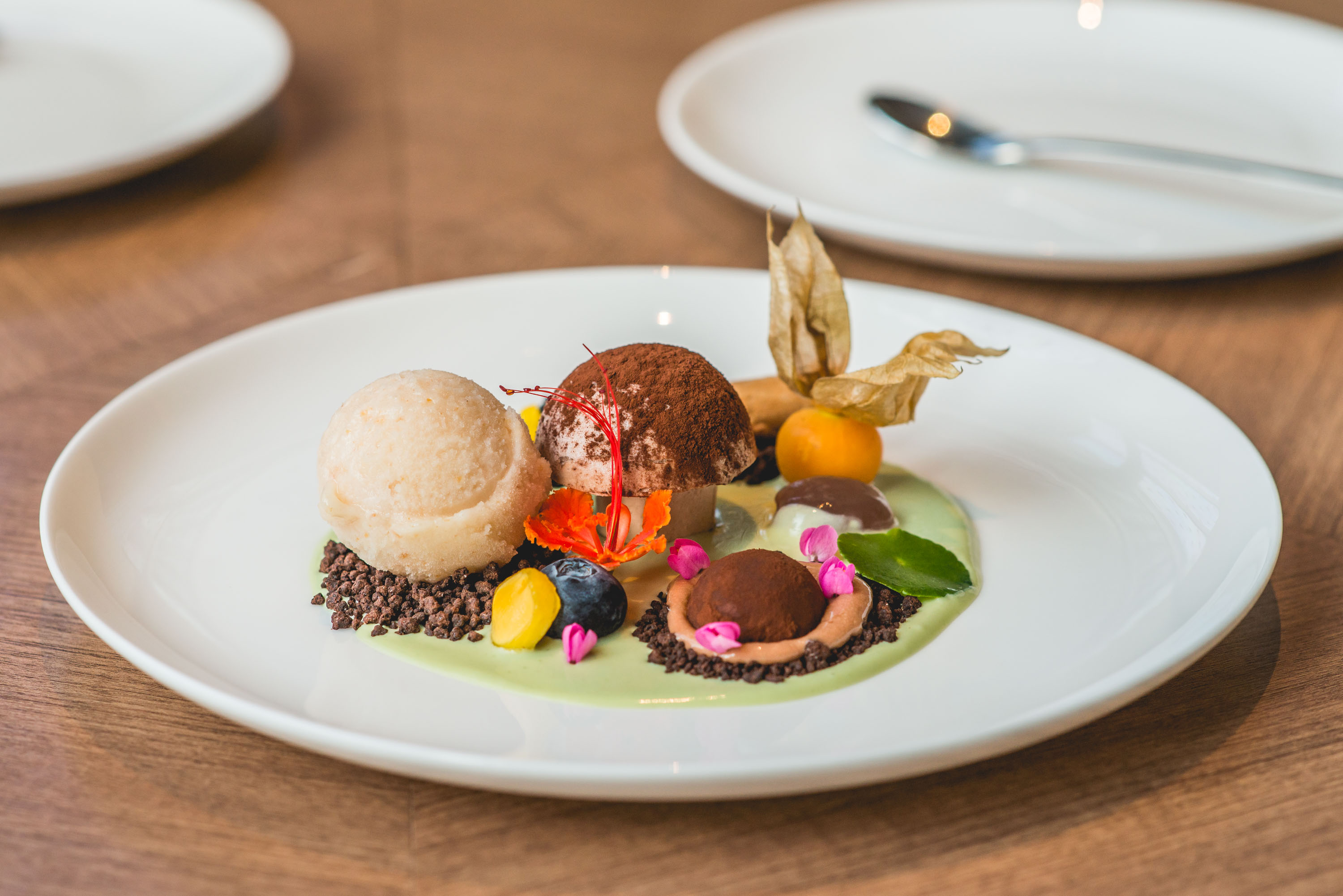 ส่วนใครที่มองหาขนมหวาน ทางร้านแนะนำ Mushrooms & Truffles (400 บาท) ขนมหวานหน้าตาสวยงามที่ประกอบด้วยขนมมากมาย เริ่มจากช็อคโกแลตพาร์เฟ่ต์รูปเห็ดชิตาเกะ เสิร์ฟคู่กับซอร์เบต์ลิ้นจี่ ช็อคโกแลตทรัฟเฟิล เคปกูสเบอร์รี่ และผลไม้สด ทั้งหมดนี้วางมาบนซอสไวท์ช็อคโกแลตใบเตย