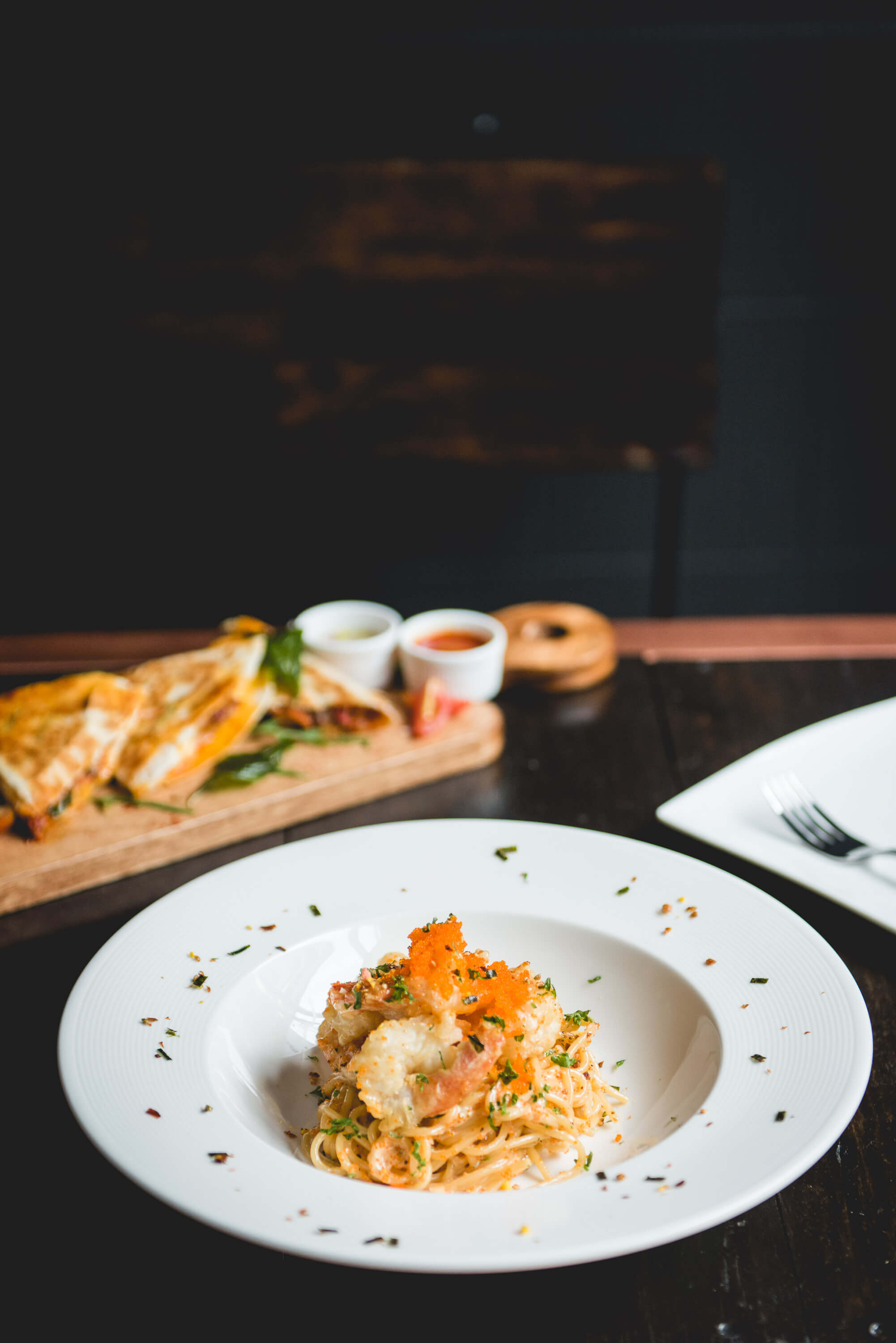 ทางร้านเน้นเสิร์ฟอาหารสไตล์ฟิวชั่น ครีเอทโดยอดีตเชฟร้าน Spring & Summer และ Jamie Oliver และทุกสัปดาห์จะมีเมนูพิเศษตลอด ลองสั่งเมนูแรกอย่าง Duck Crepes with Red Curry Paste (220 บาท) เป็ดย่างคลุกเคล้ากับซอสแกงเผ็ดและชีส ห่อด้วยแป้งตอร์ติญ่ากรอบ ๆ เสิร์ฟกับอาจาดและซอสแกงเผ็ดให้ทานคู่กัน ได้รสชาติเผ็ดสไตล์ไทย